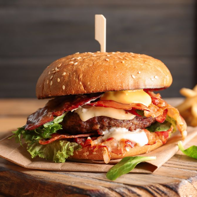 160 g De carne Angus artesanal, tocineta, queso americano, cebolla grille caramelizada, salsa de ajo.