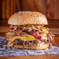 160 g De carne Angus artesanal, carne desmechada, jamón, queso americano, maduritos fritos, salsa de ajo.