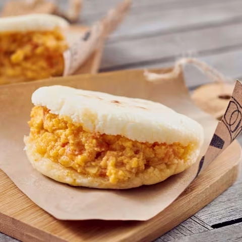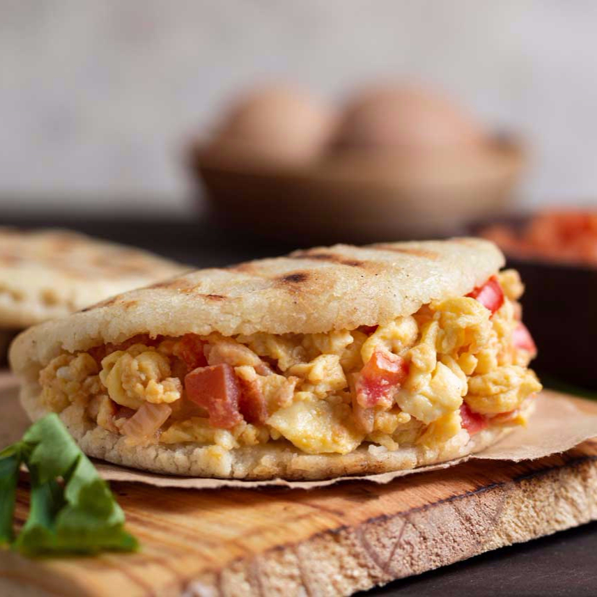 Deliciosa arepa paisa elaborada en maiz blanco, rellena de huevos revueltos con hogao al estilo colombiano, acompañada de una gaseosa postobon 250ml gratis