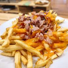 200 gr De papas a la francesa, salchicha, pollo desmechado, carne desmechada, brunoise de platanitos maduros fritos, queso, salsas.