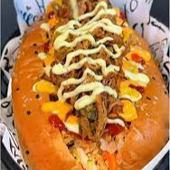 PAN ARTESANAL DE PERRO CALIENTE, CON SALCHICHA TIPO AMERICANA, CARNE DESMECHADA, TOCINETA PICADA TOSTADA, MAIZ, PAPA CABELLO DE ANGEL, SALSA DE AJO Y SALSA ROSADA.