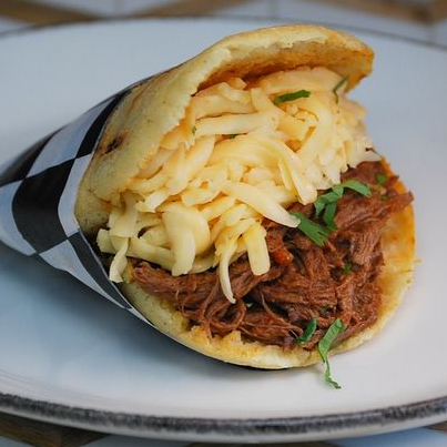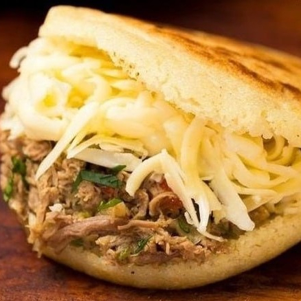 Deliciosa arepa rellena de lomo de cerdo desmechado en hogao, queso mozzarella y tocineta frita.