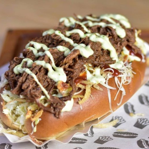 Carne desmechada, tocineta, queso mozzarella, cebolla grille caramelizada, papa chips, salsa de ajo.