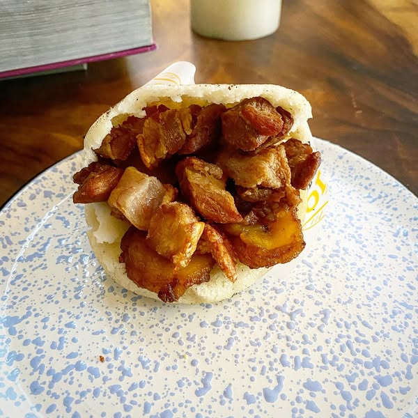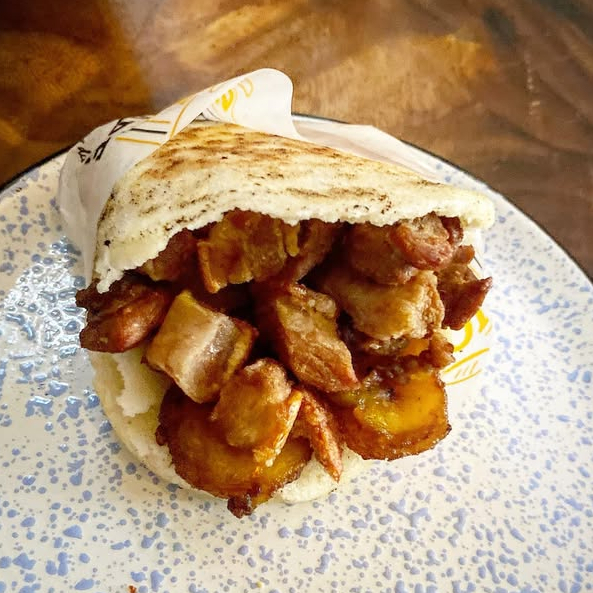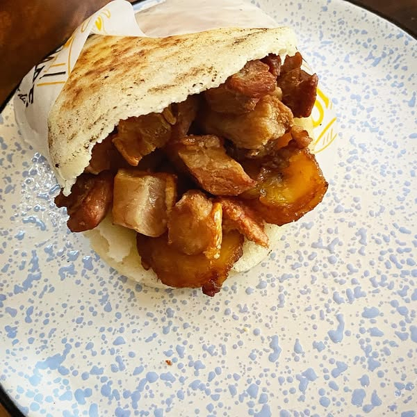 Deliciosa arepa rellena de cerdo en hogao, brunoise de plátano maduro frito y chicharrón carnudo en cubos.