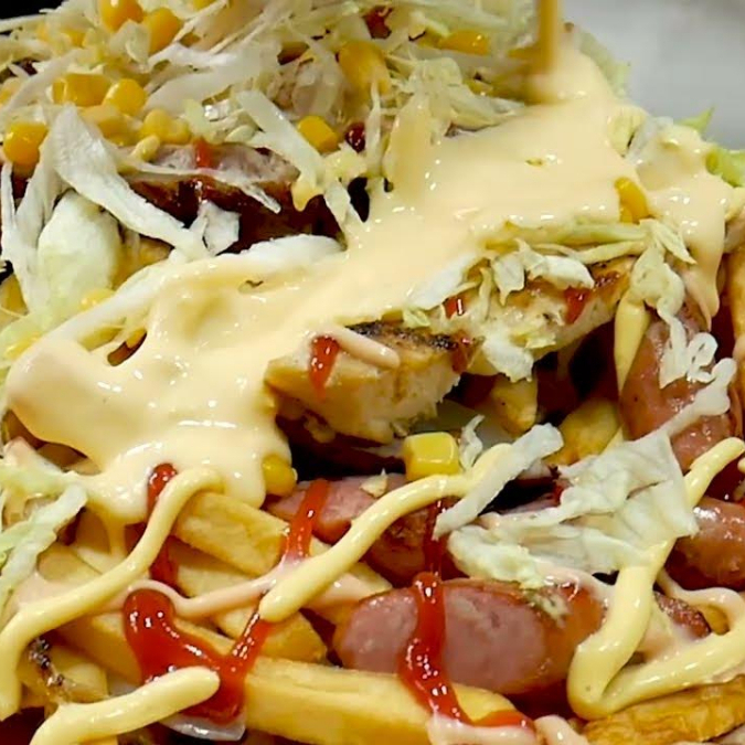 350 g De papas a la francesa, salchicha doble, pollo y carne desmechada, tocineta, chicharrón de panceta y salsas.