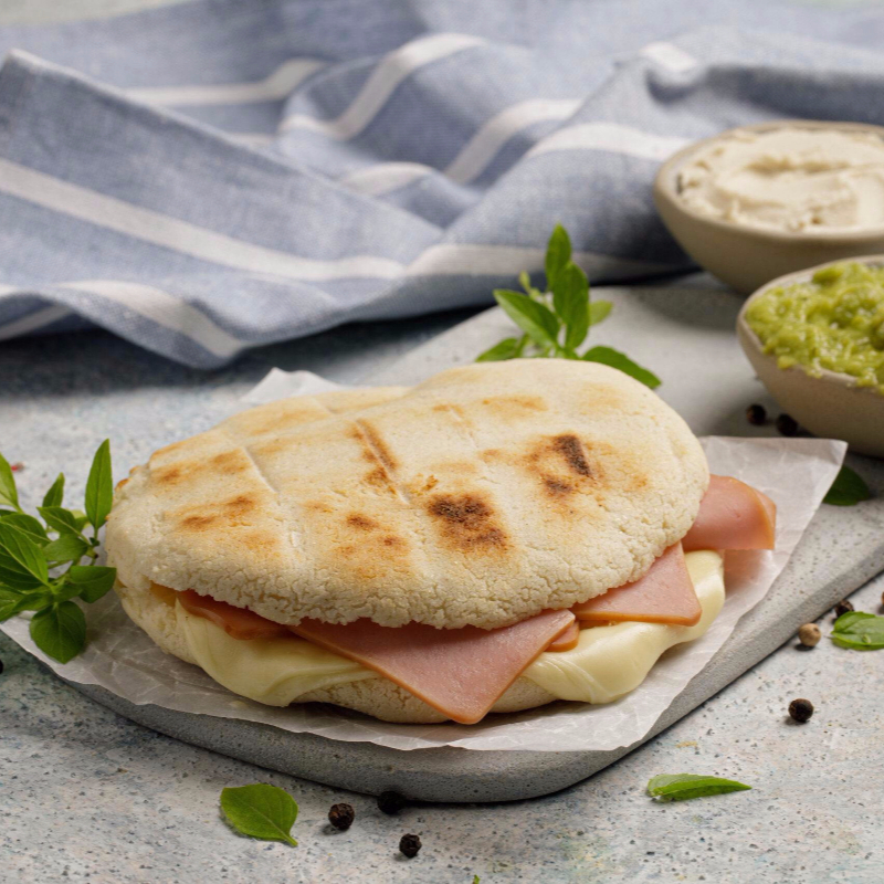 Deliciosa arepa elaborada en maiz blanco, rellena de jamón y queso tajado, acompañada de una gaseosa postobon 250ml gratis