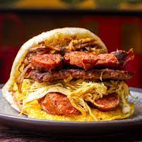 Deliciosa arepa rellena de carne desmechada en hogao, chicharrón carnudo en cubos, queso mozzarella, chorizo y maíz desgranado.