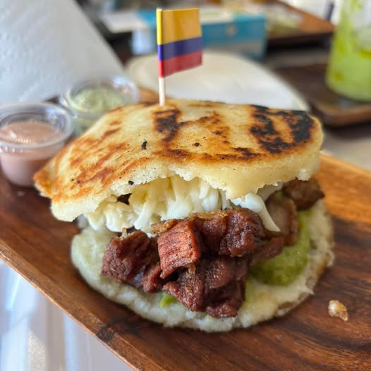 Deliciosa arepa rellena de cerdo y carne en hogao, queso mozzarella, jamón y huevos de codorniz.