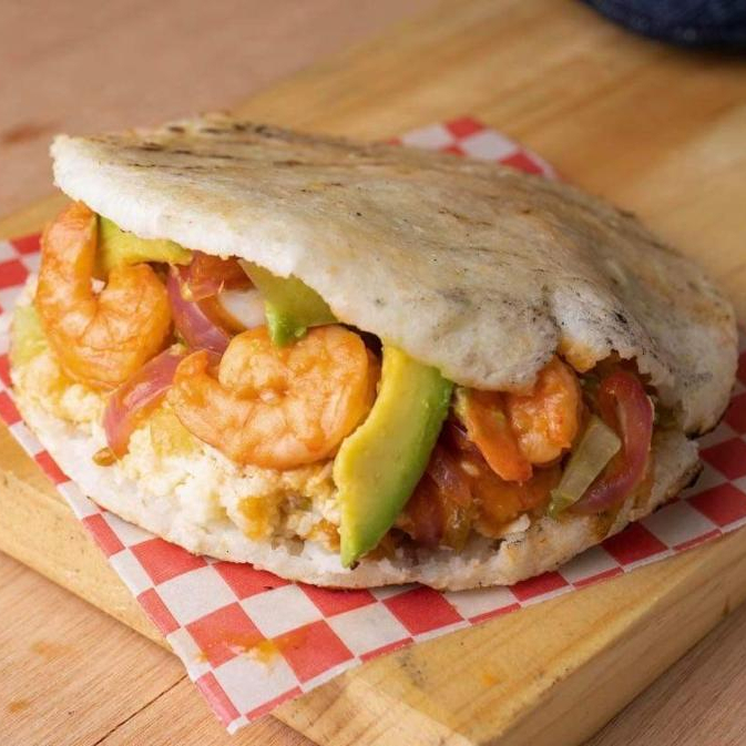 Deliciosa arepa rellena de camarones salteados en hogao de la casa, queso gratinado, vegetales de temporada y raíz china.