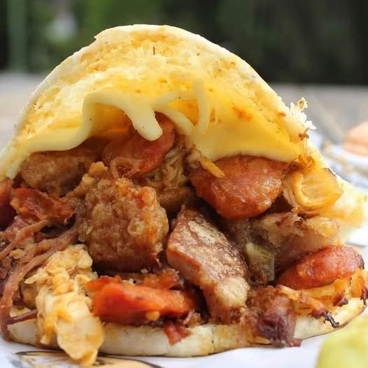 Deliciosa arepa rellena de cerdo y carne desmechada en hogao, chicharrón carnudo en cubos, queso mozzarella, chorizo y maíz desgranado.