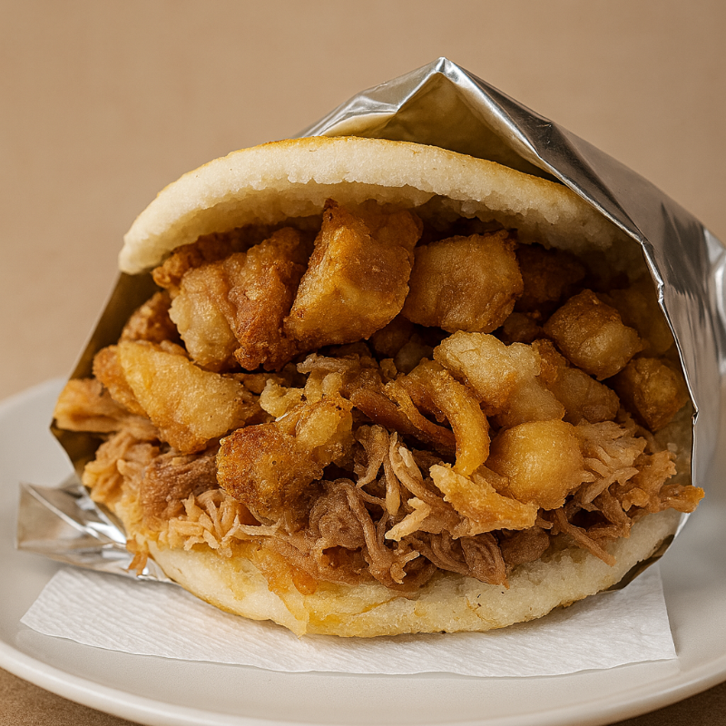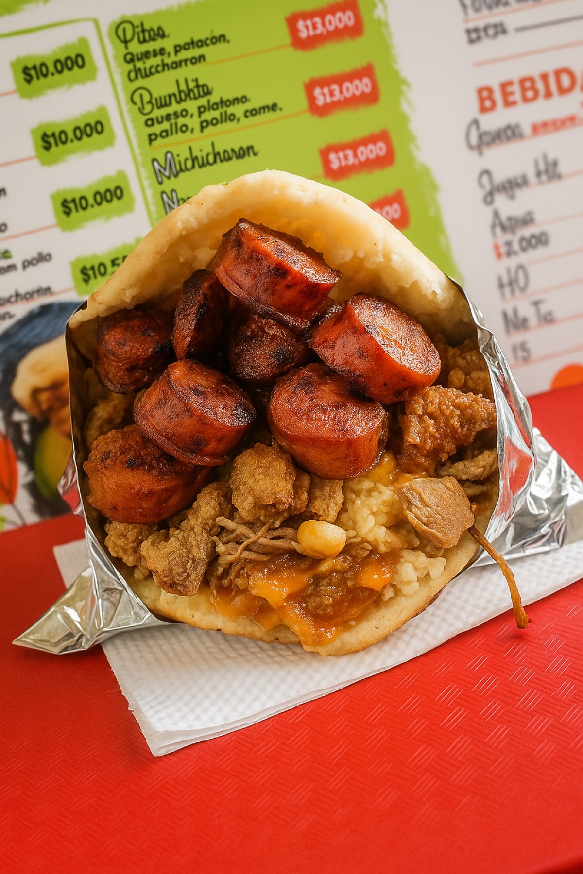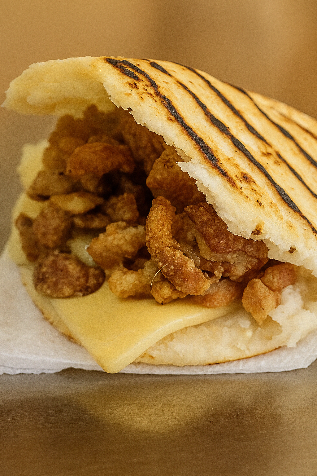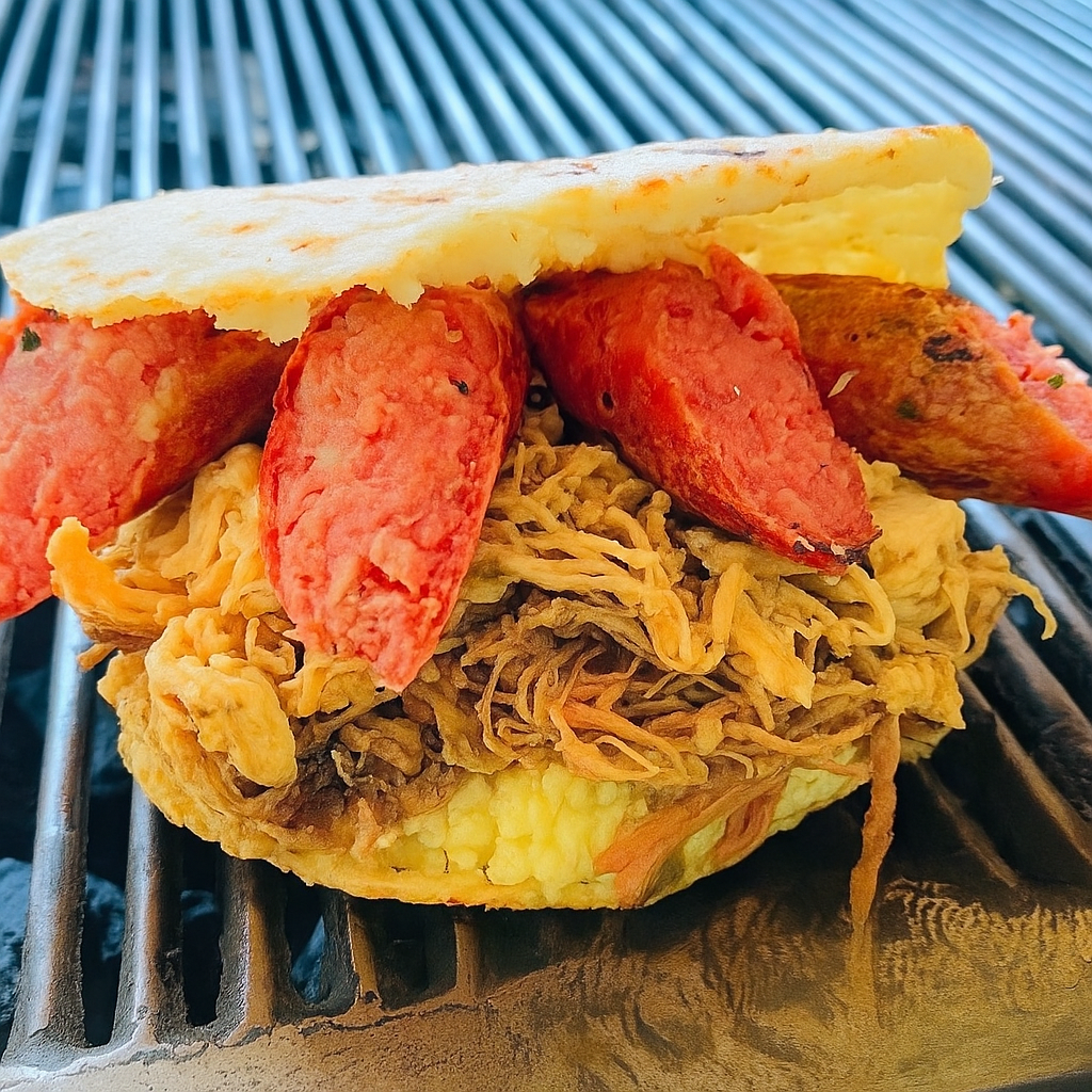 Arepa con queso, chorizo de cerdo, tocineta y pepperoni.