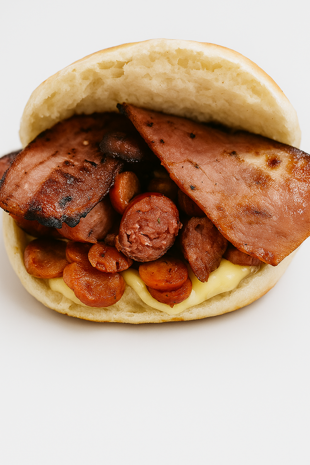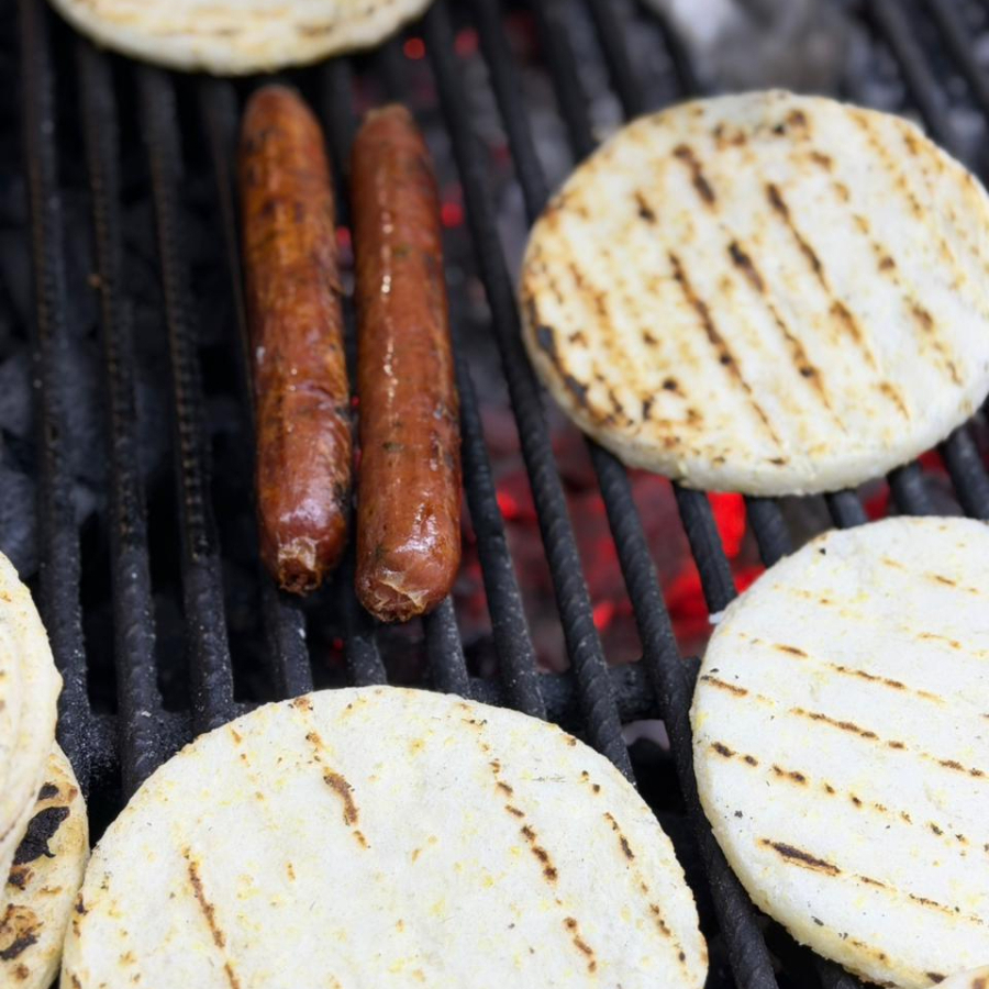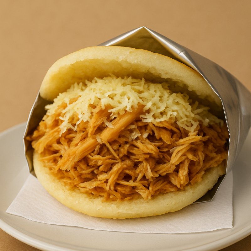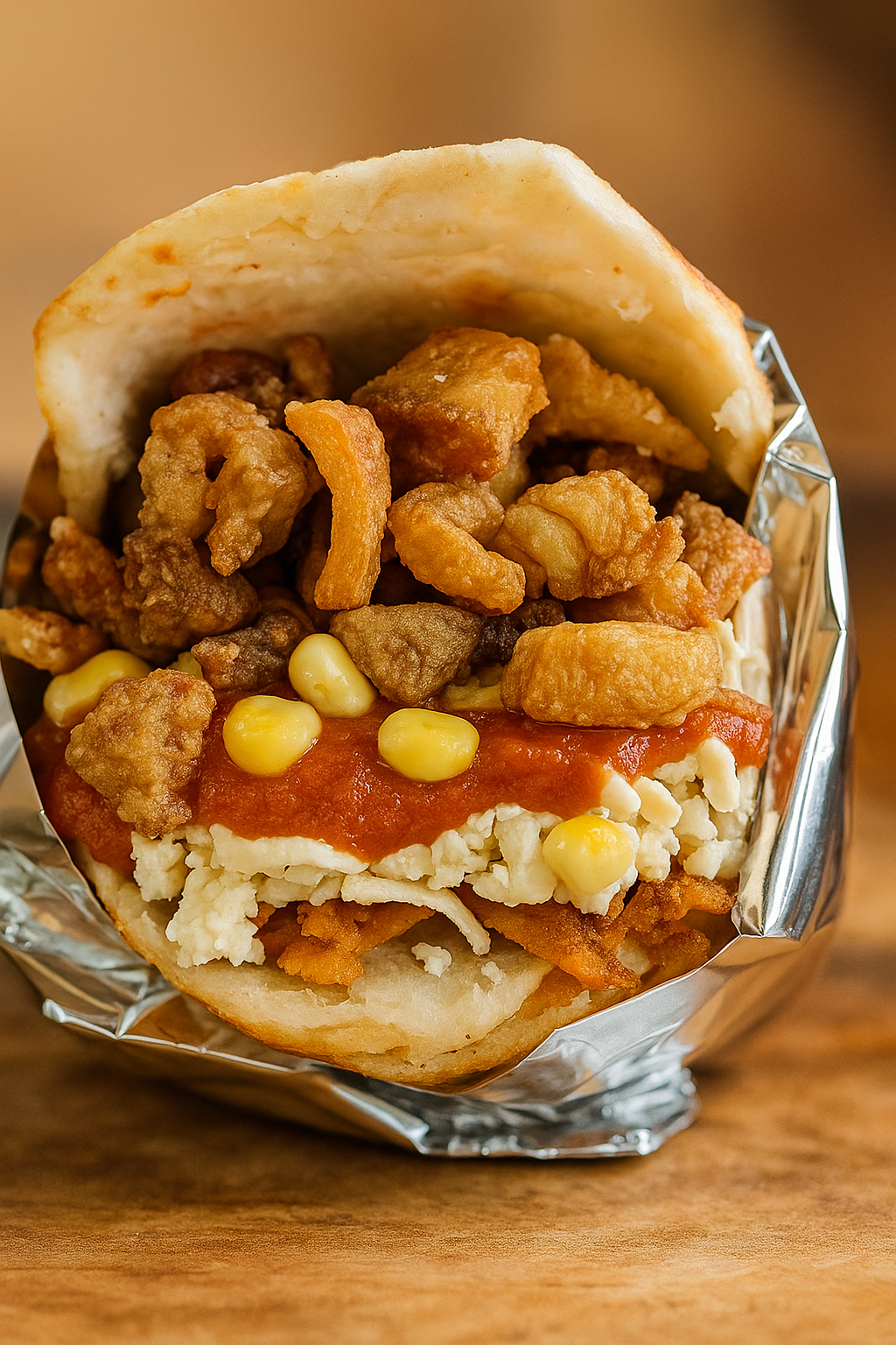 Arepa con queso, chorizo de cerdo, tocineta y pepperoni.