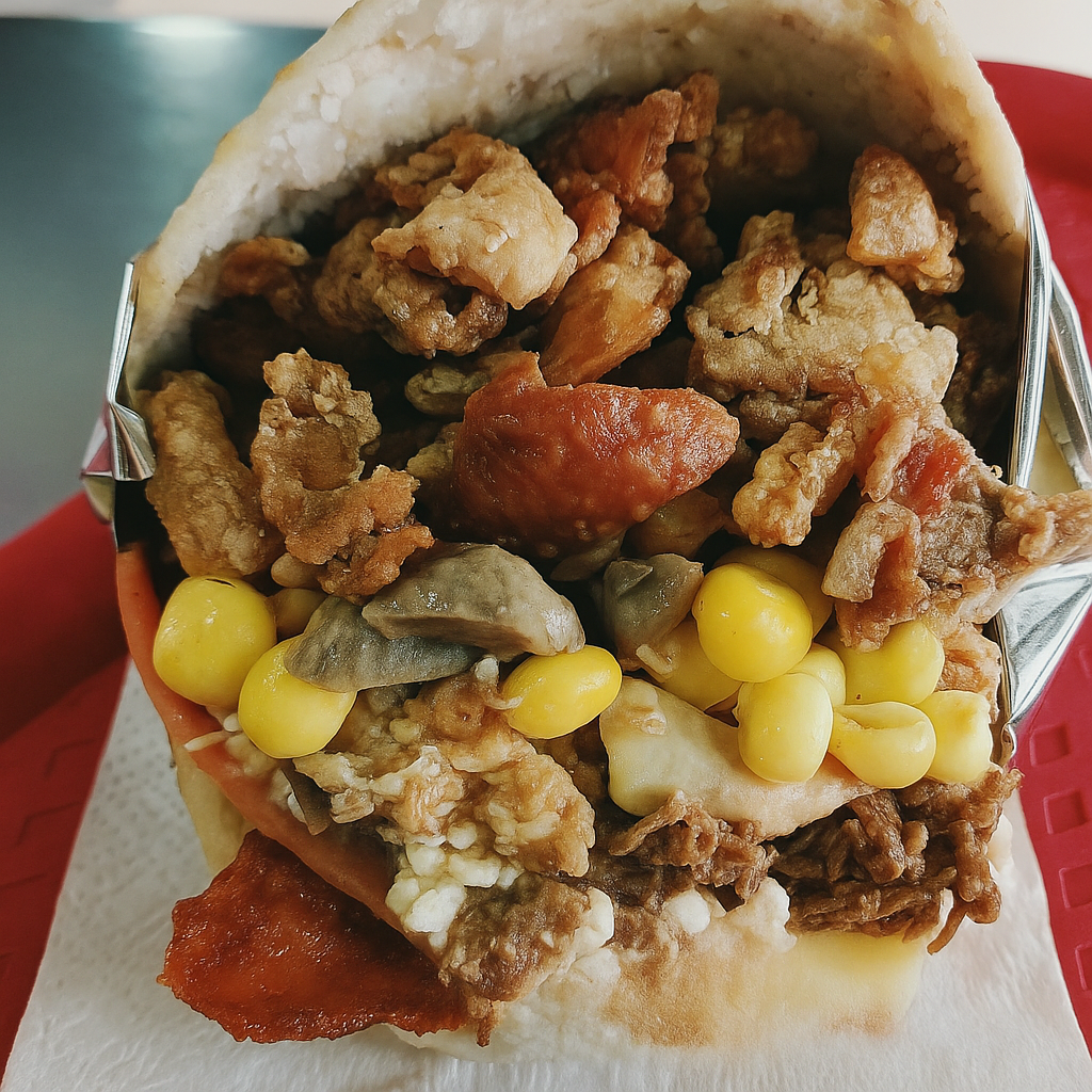Arepa con queso, 2 carnes, piña, jamón y tocineta.