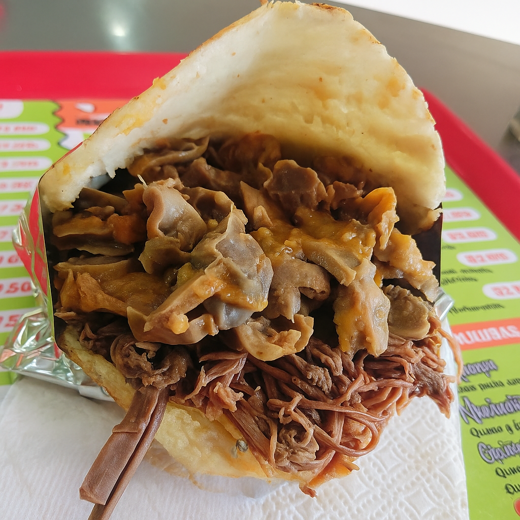 Arepa con queso, carne de hamburguesa, piña, jamón y tocineta.