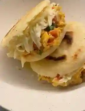 Arepa rellena de carne, tocineta, trocitos de chorizo, queso y salsas de la casa.