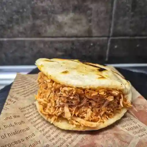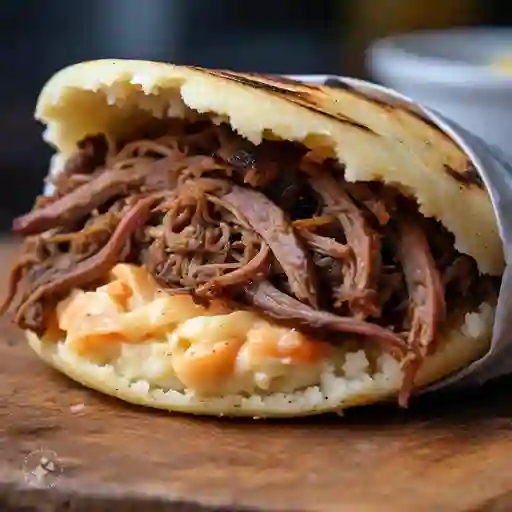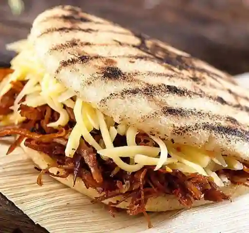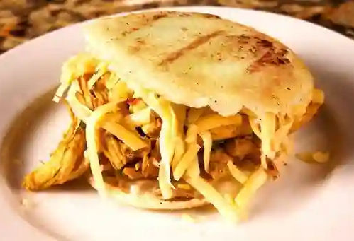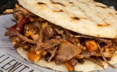 Arepa rellena de carne de cerdo desmechada, patacón en trozos, jamón y maíz tierno.