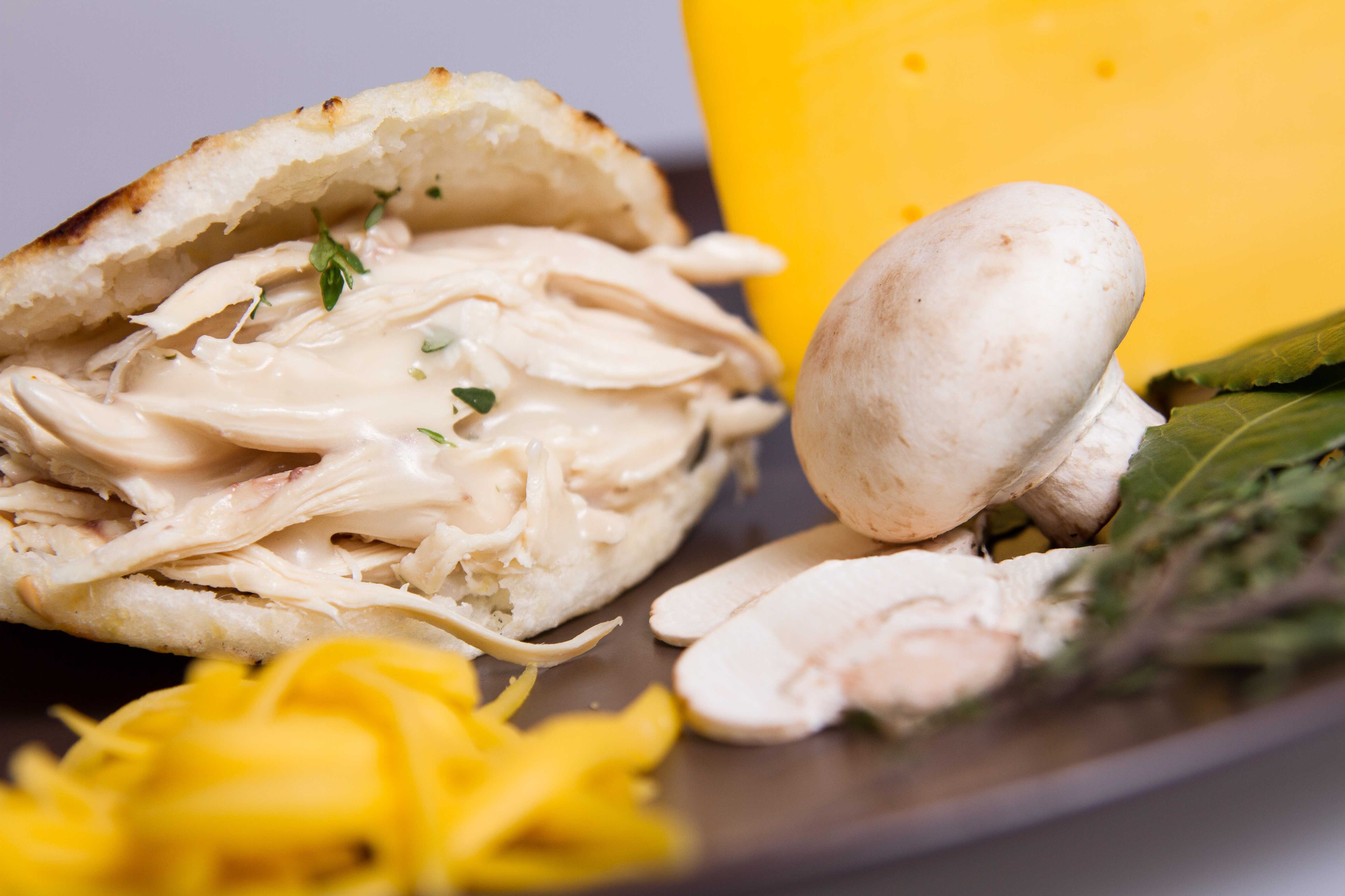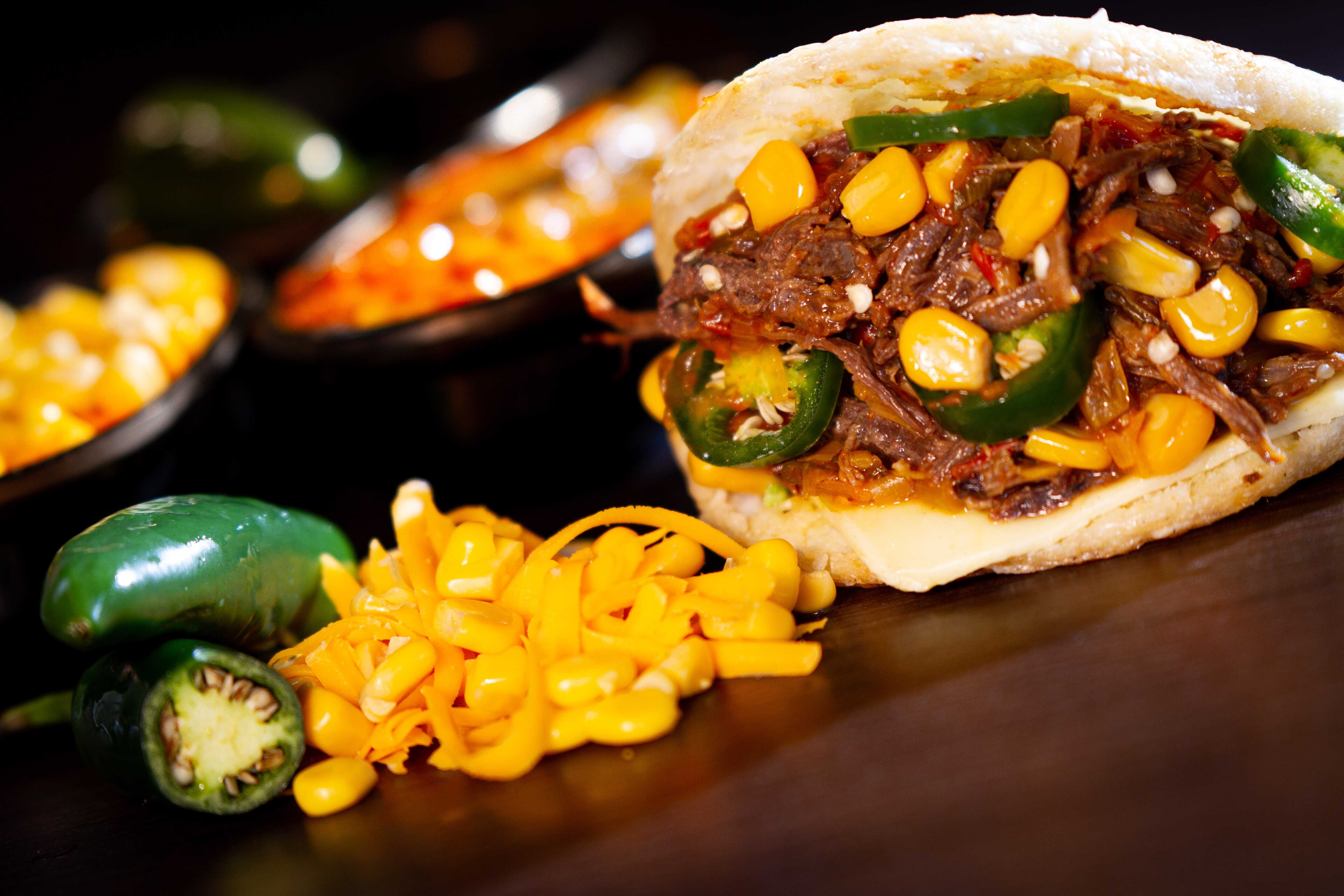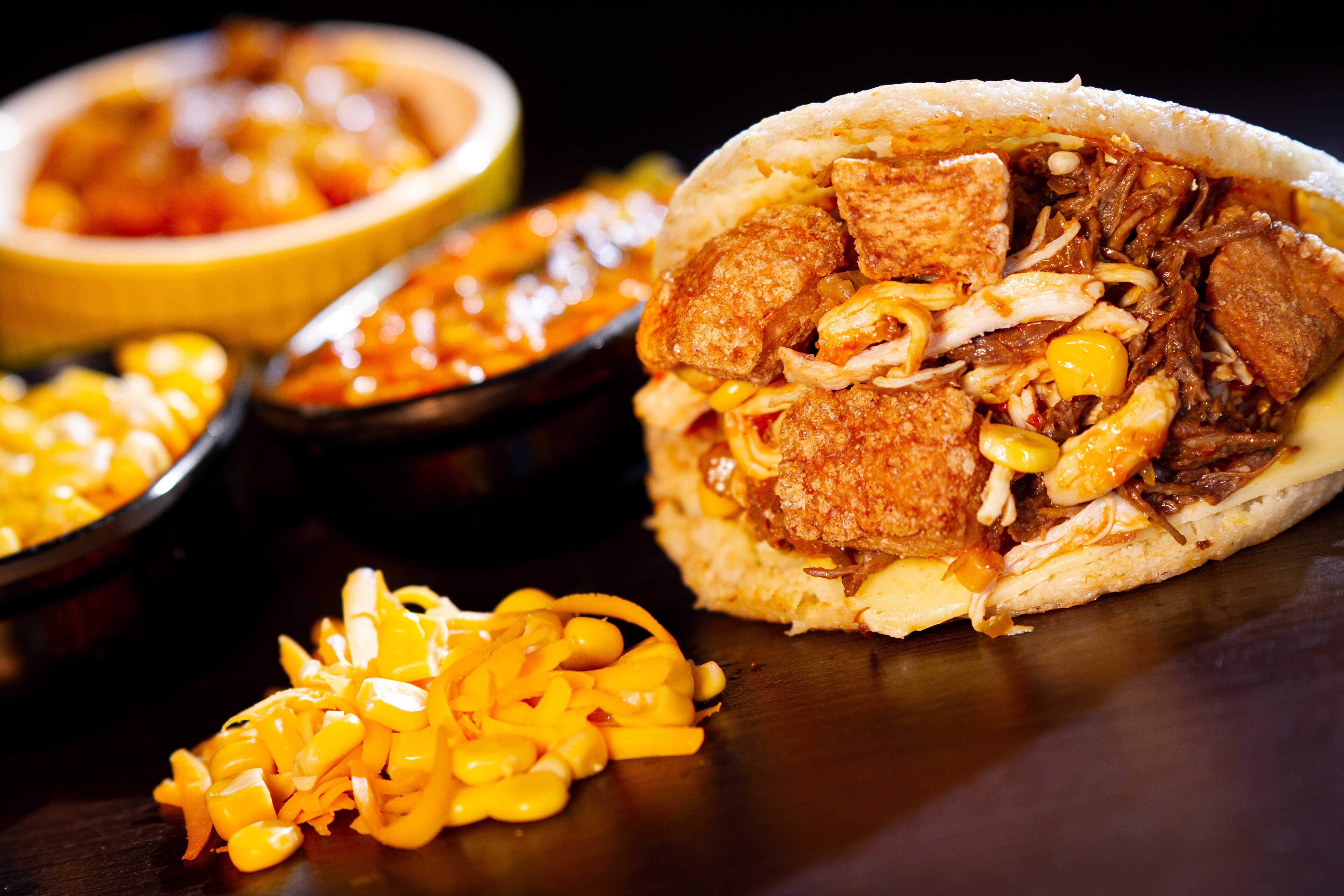Carne desmechada, pollo desmechado, hogao, maíz tierno, chorizo, chicharrón y queso doble crema.