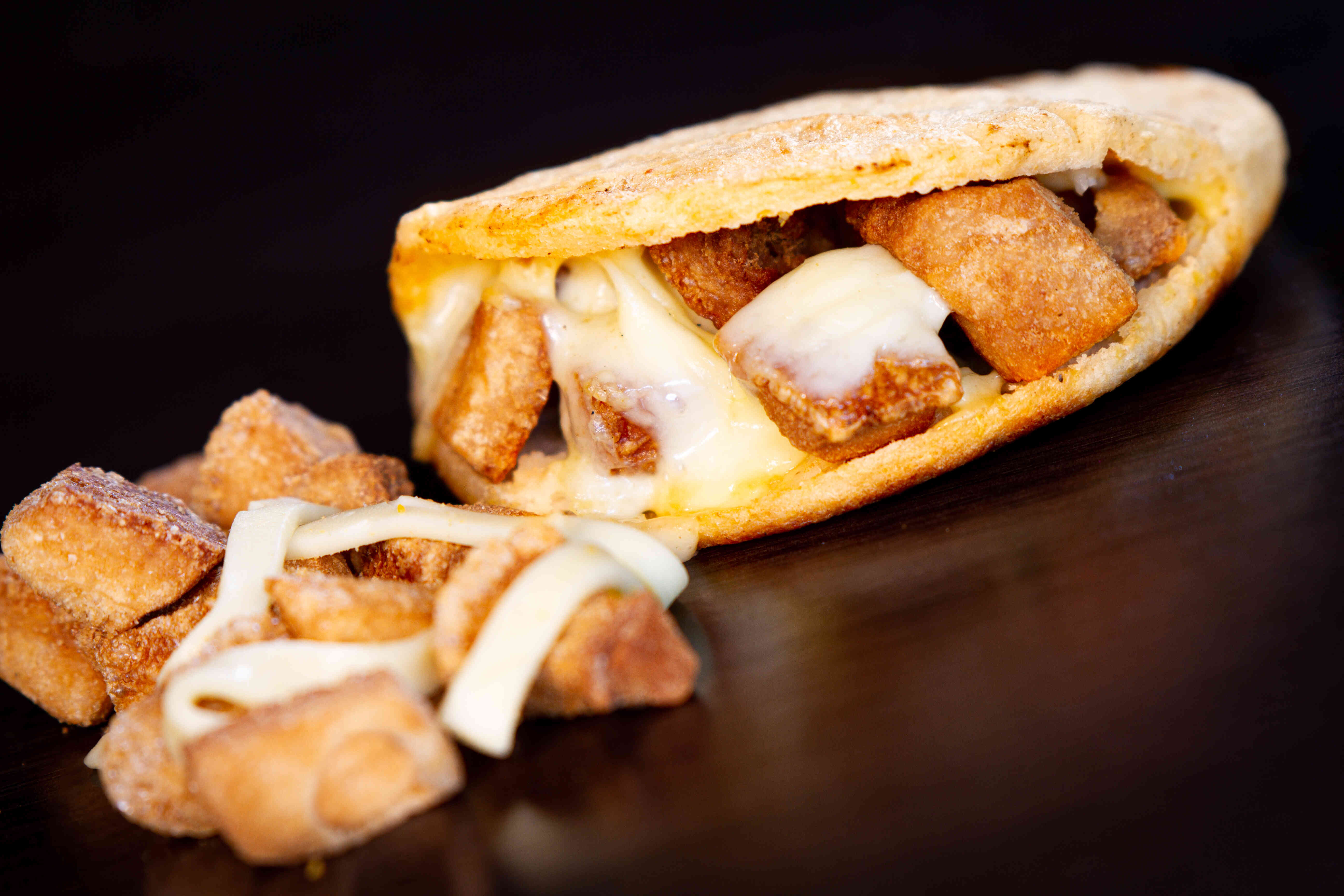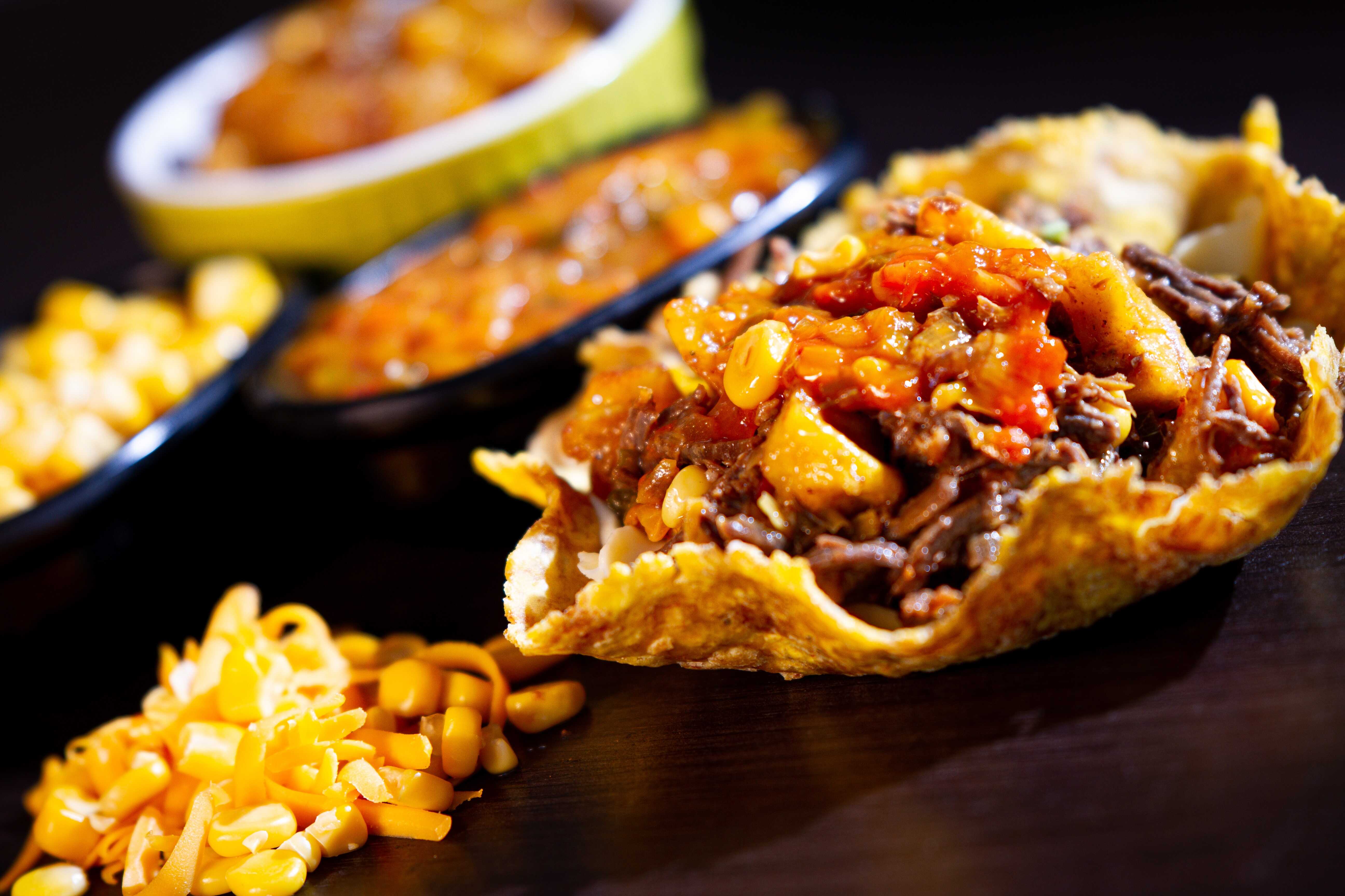 Carne desmechada, hogao, maíz tierno, plátano maduro, queso doble crema y queso holandés sobre una canastilla de patacón crocante.