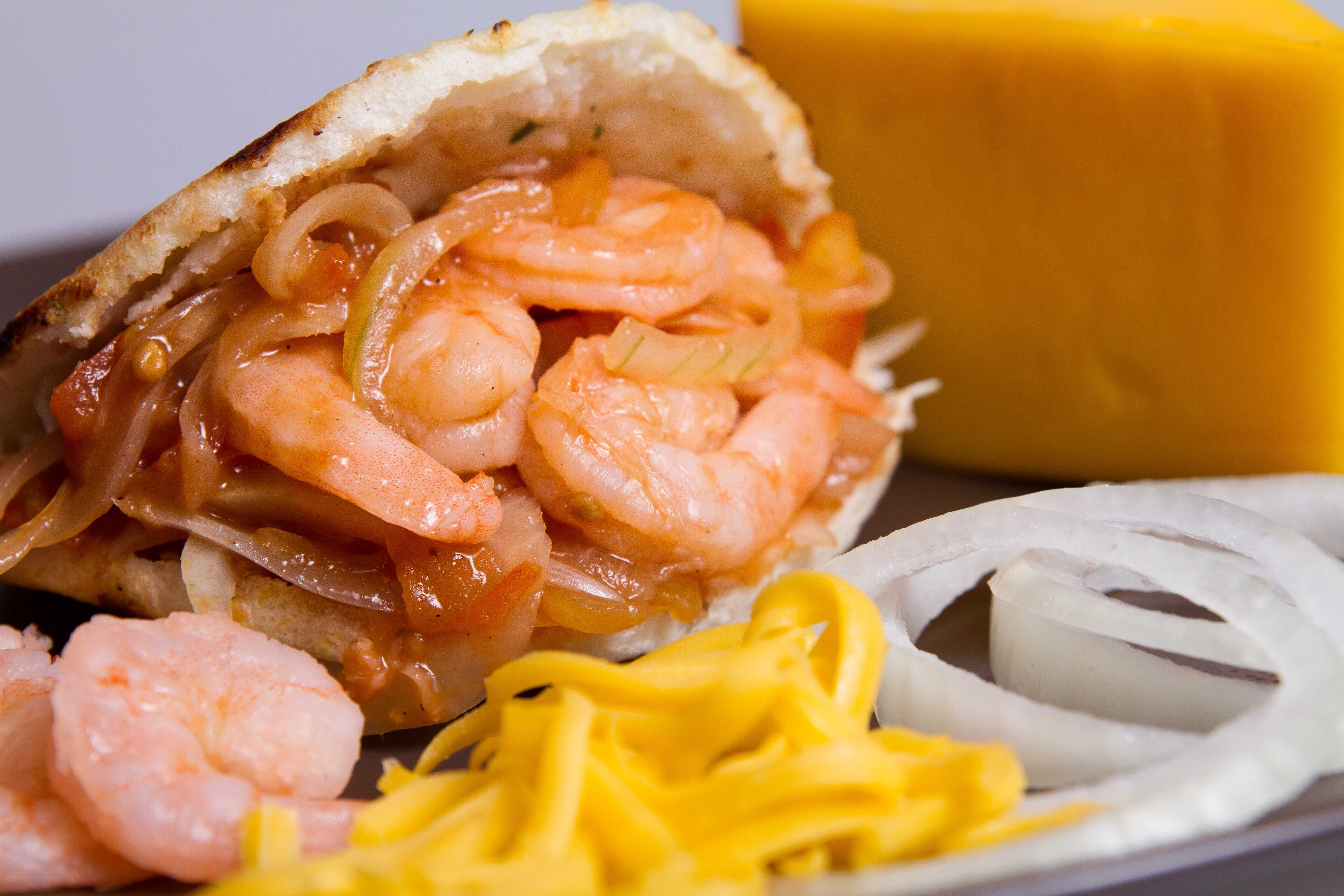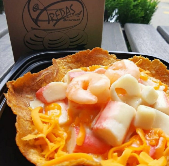 Camarón tigre, palmitos de cangrejo, anillos de calamar, salsa marinera, queso doble crema y queso holandés sobre una canastilla de patacón crocante.