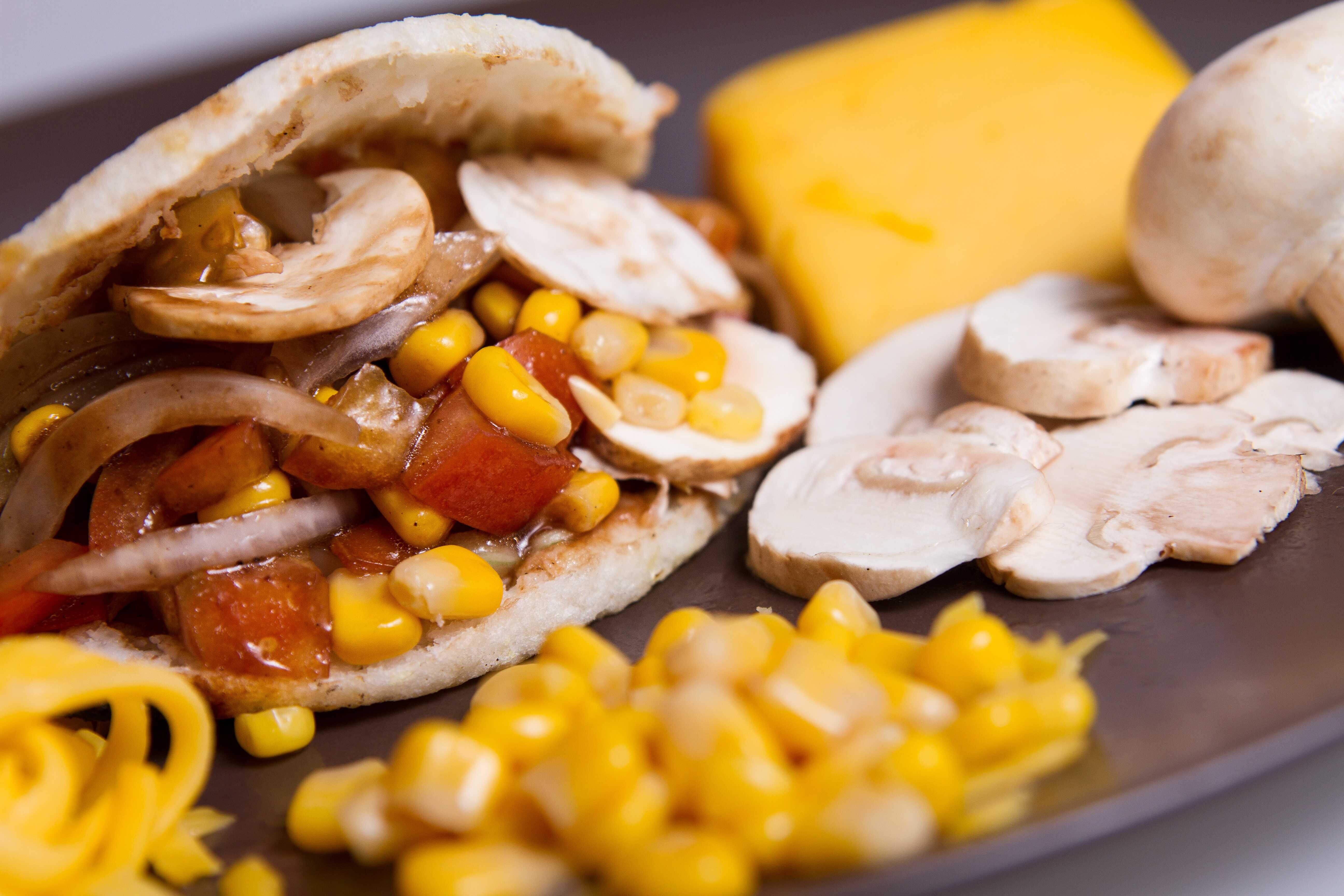 Cebolla, Tomate, Champiñones frescos, maíz tierno, queso doble crema y queso holandés.