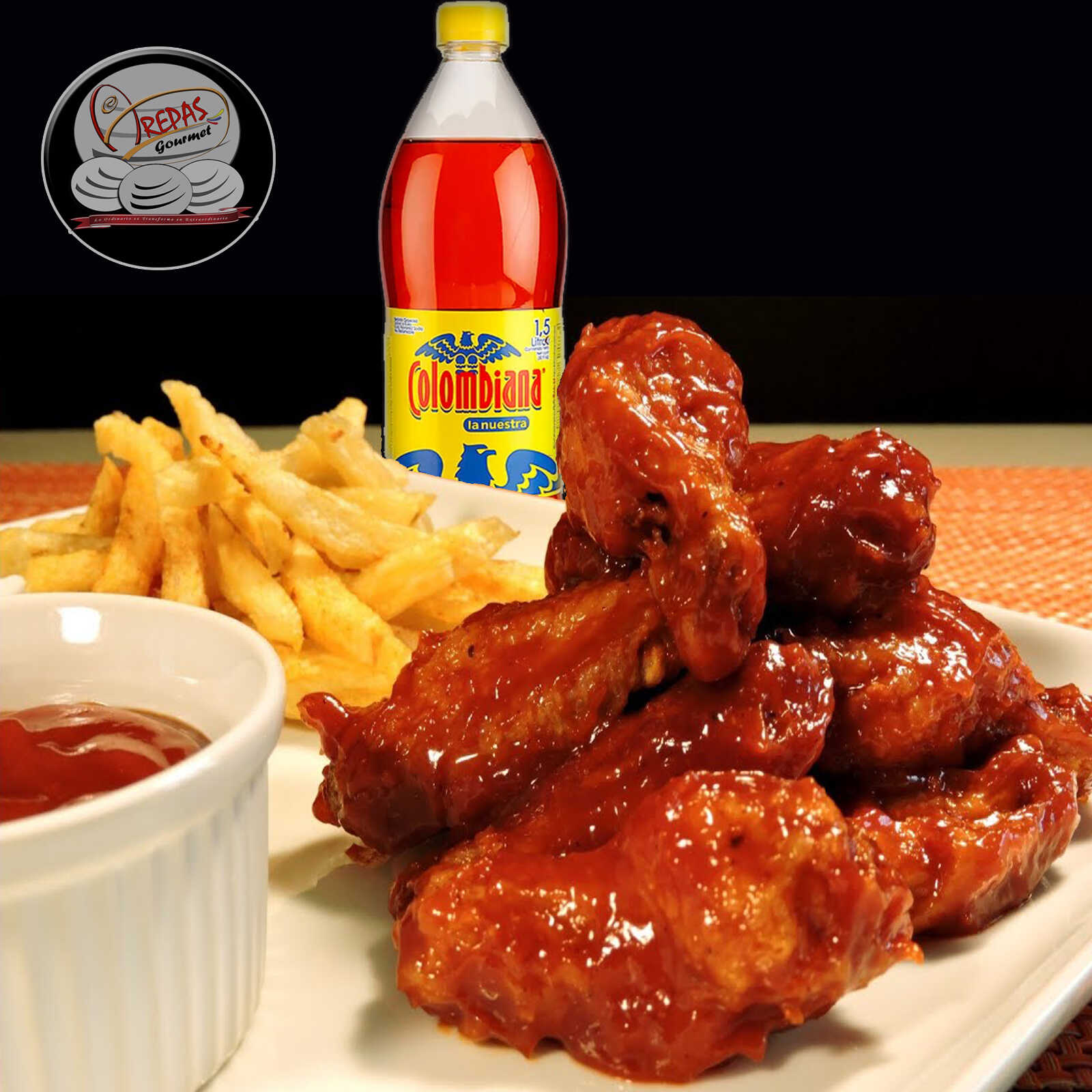 Alas x 30 Unidades. Bañadas en salsa BBQ, acompañadas con 2 porción de Papa a la Francesa y 1 Gaseosa 1.5 lts Postobón