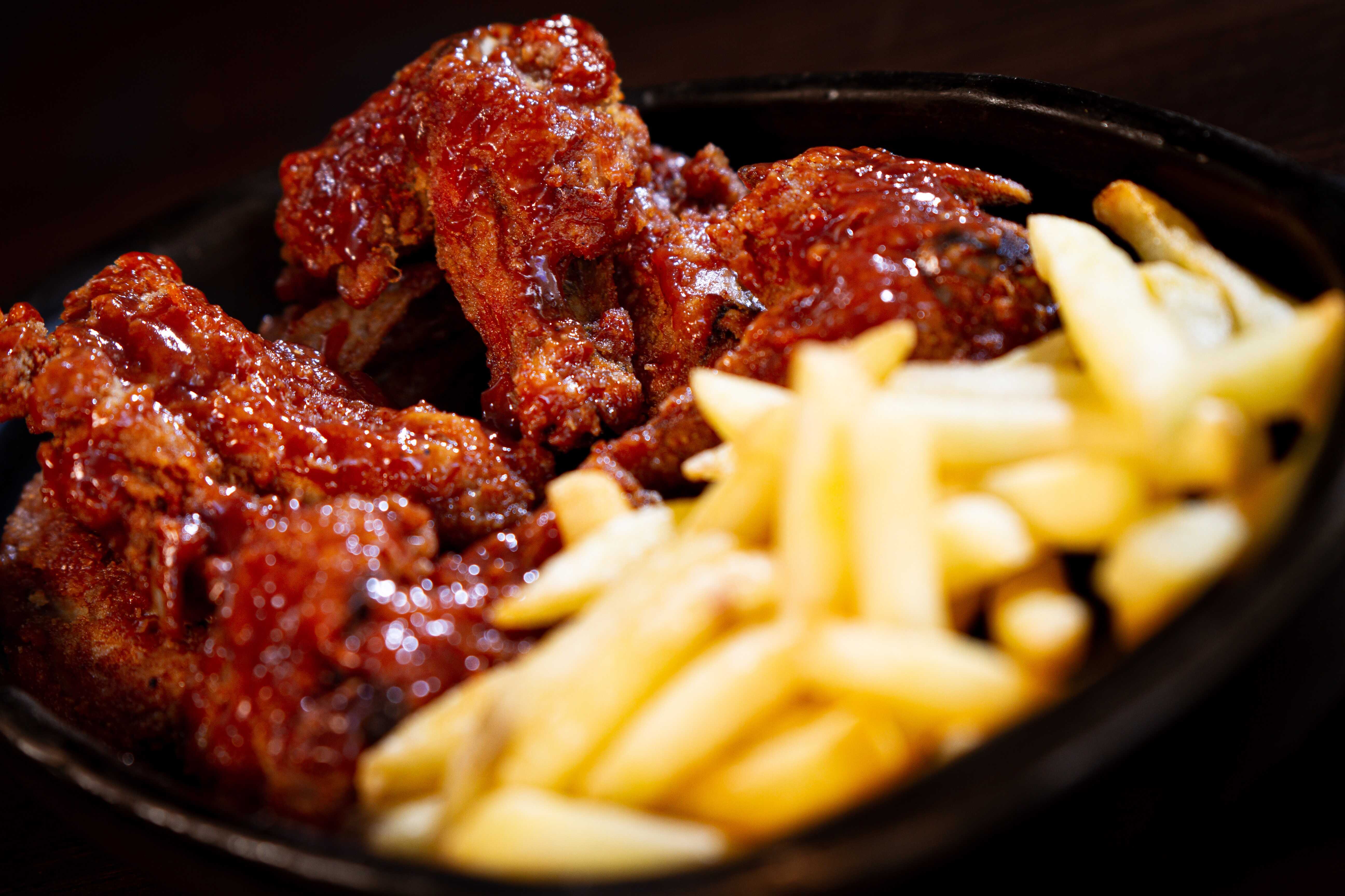 Alas x 6 unidades, en salsa BBQ o Salsa Miel Mostaza. Acompañadas con Papas a la Francesa.