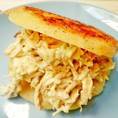 Deliciosa arepa rellena de huevos revueltos y queso.