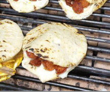 Arepa rellena de maíz tierno, chorizo, queso doble crema, salsa de tomate y salsa BBQ, papas chips y huevo de codorniz.
