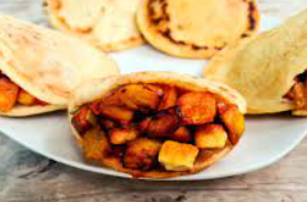 Deliciosa arepa rellena de huevos rancheros (salchicha queso).