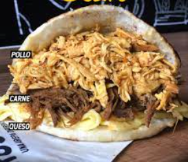 Arepa rellena de carne y pollo, queso doble crema, jamón de cerdo, chorizo y huevo.