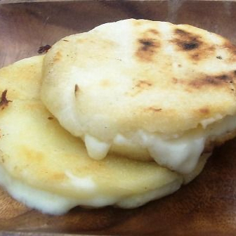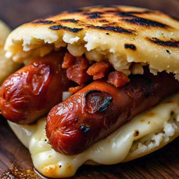 arepa paisa rellena con queso acompañado de un chorizo tipo longaniza artesanal