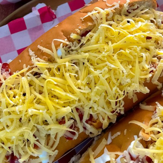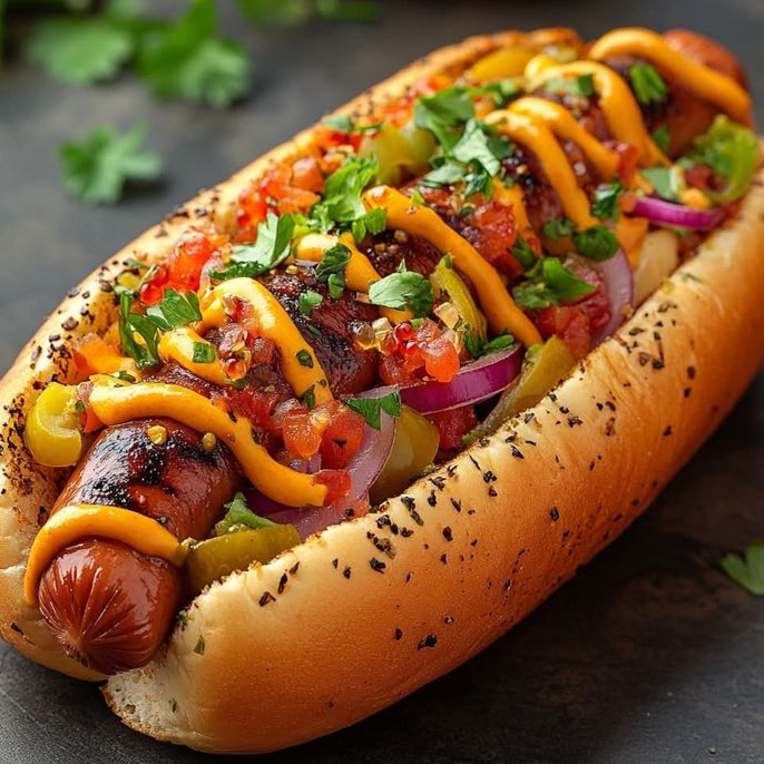 perro compuesto por pan artesanal, salchicha americana, queso mozarela, cebolla, papas chip, salsas, huevos de codornis