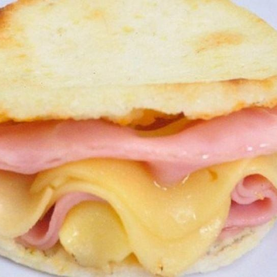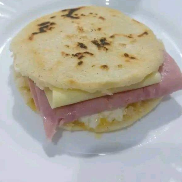 arepa paisa rellena con carne desmechada, queso tajado, jamón ahumado, salsa de la casa, huevo de codorniz