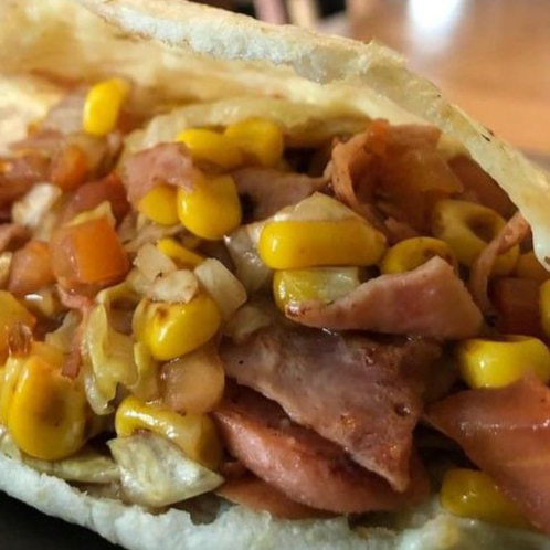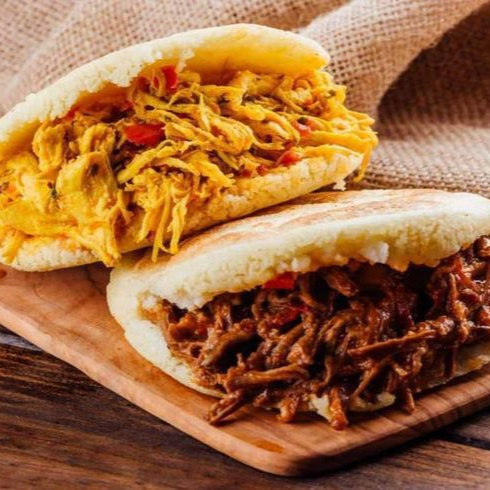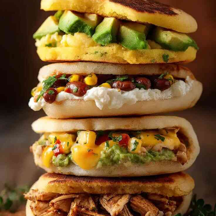 arepa paisa rellena con carne desmechada, salsa de la casa, jamon ahumado, queso mozarela, chorizo, maíz tierno, huevos de codorniz