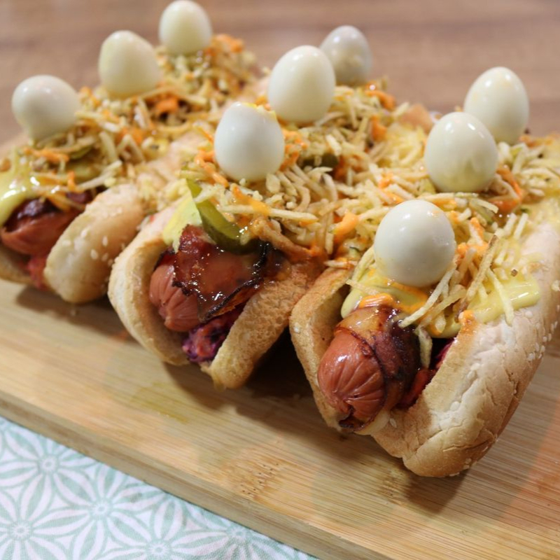 perro compuesto por pan artesanal, 2 salchicha americana, queso mozarela, cebolla, papas chip, salsas, huevos de codorniz