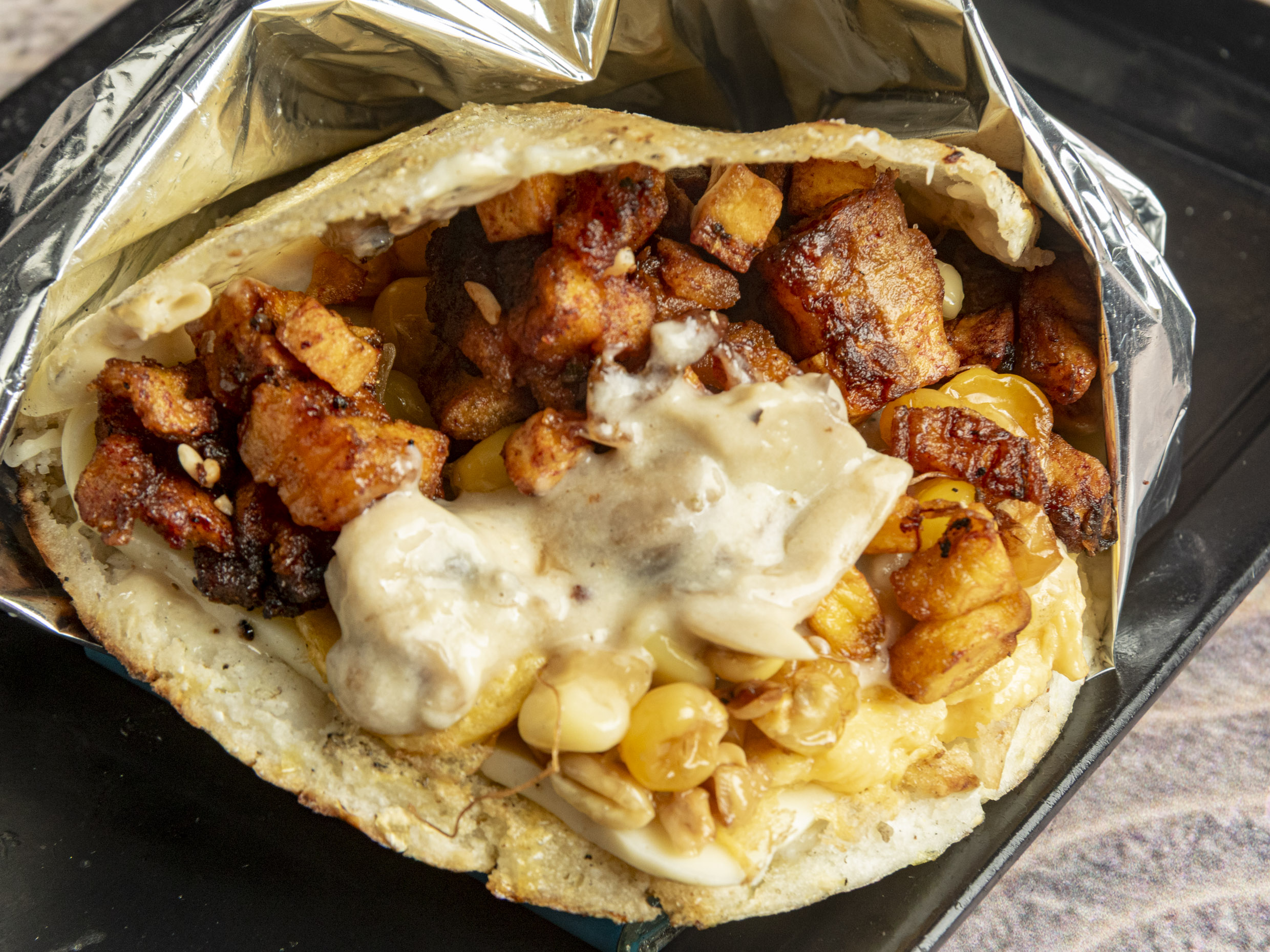 Arepa a base de maíz blanco, rellena de cerdo BBQ, queso, sal y mantequilla.