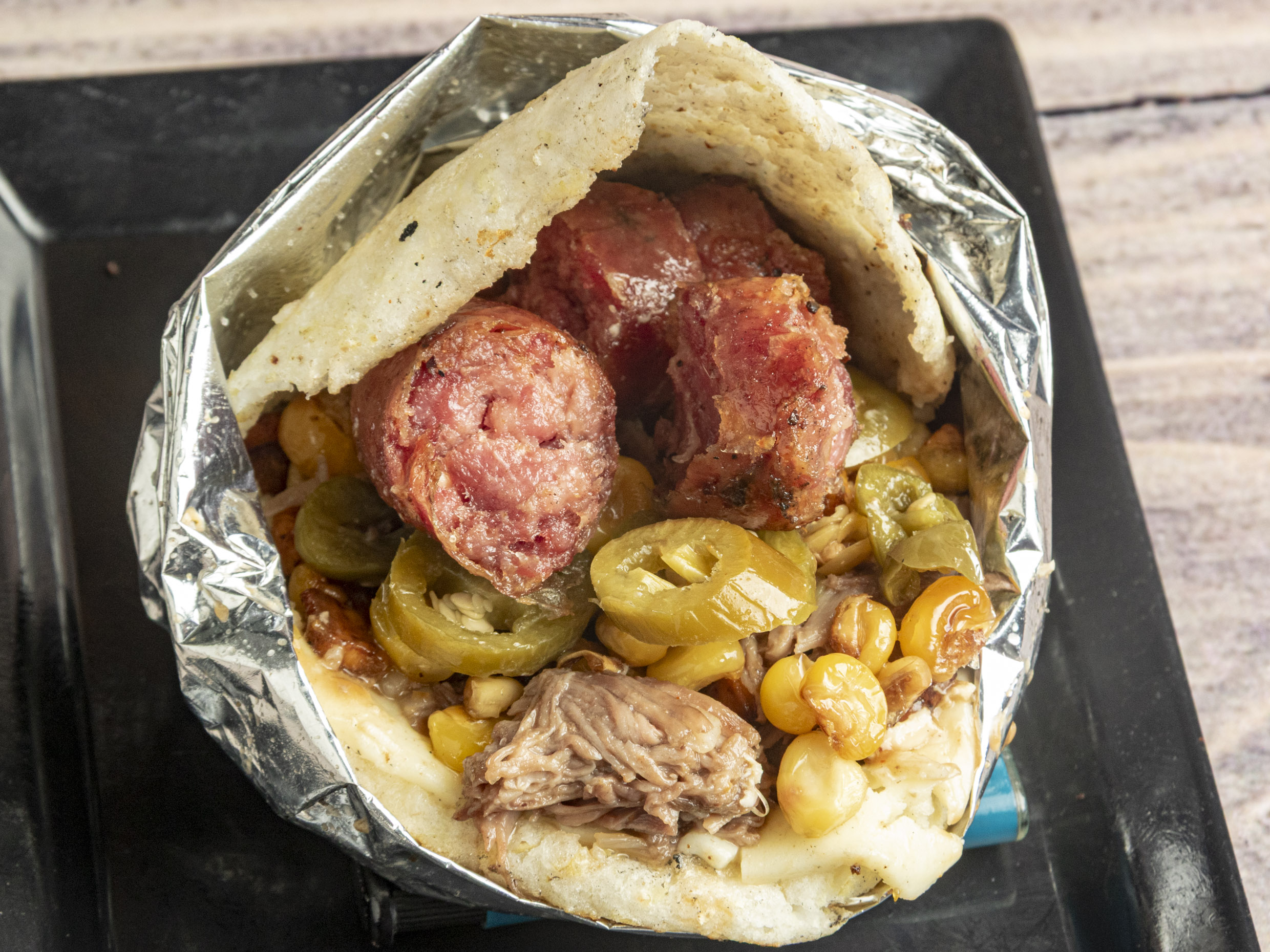 arepa blanca a base de maiz rellena de carne queso mazorca jalapeños chorizo y aji de la casa