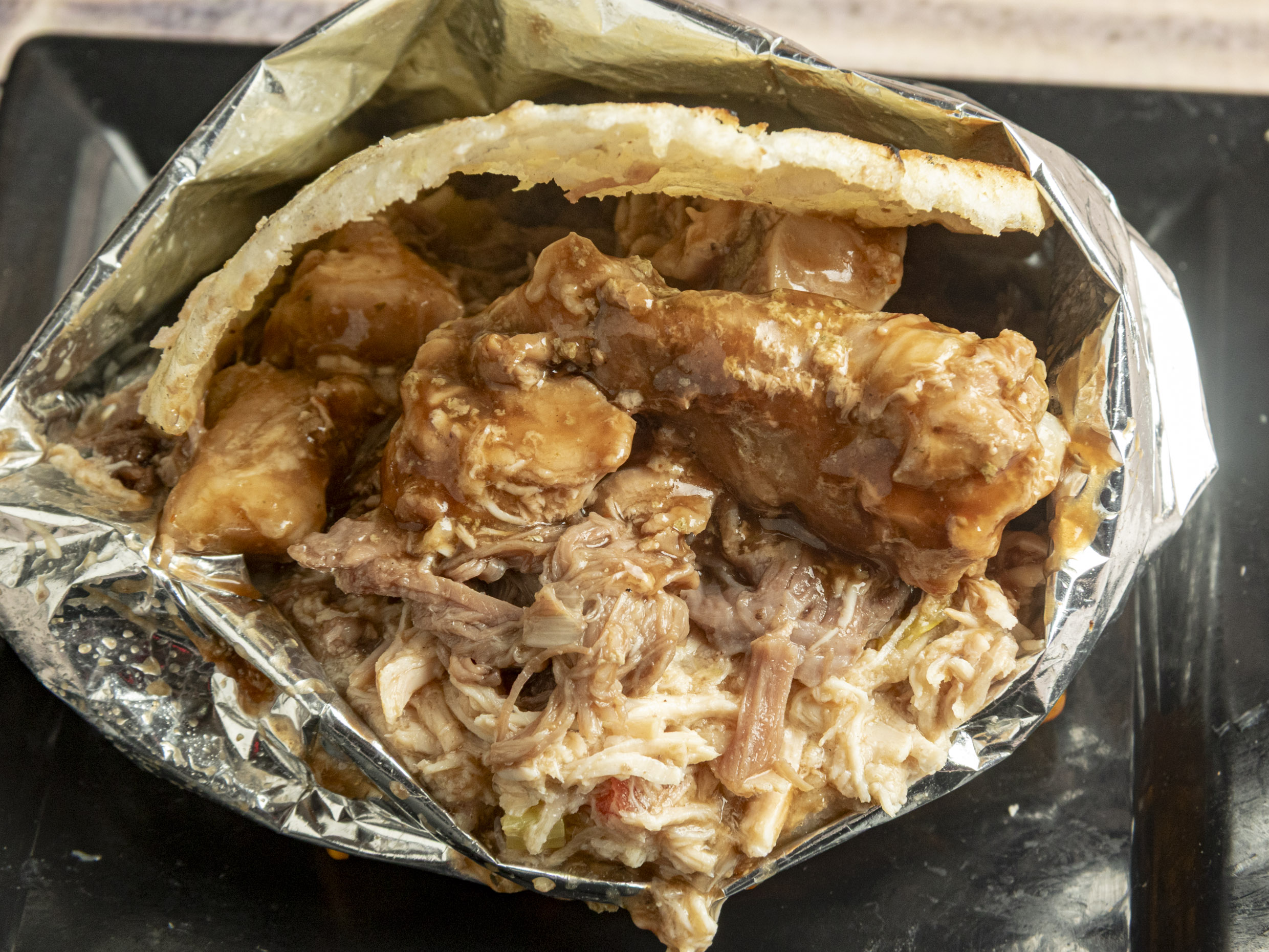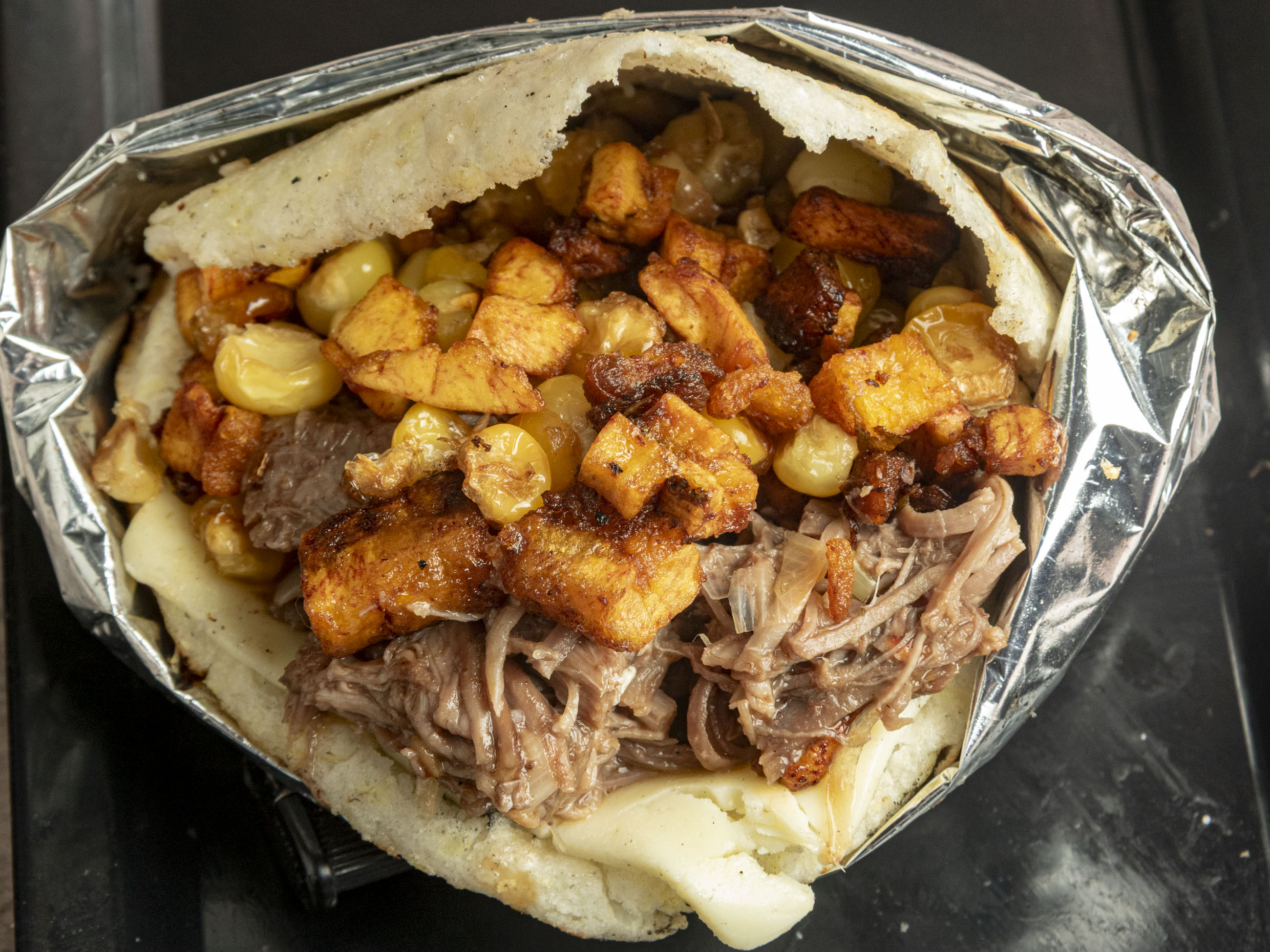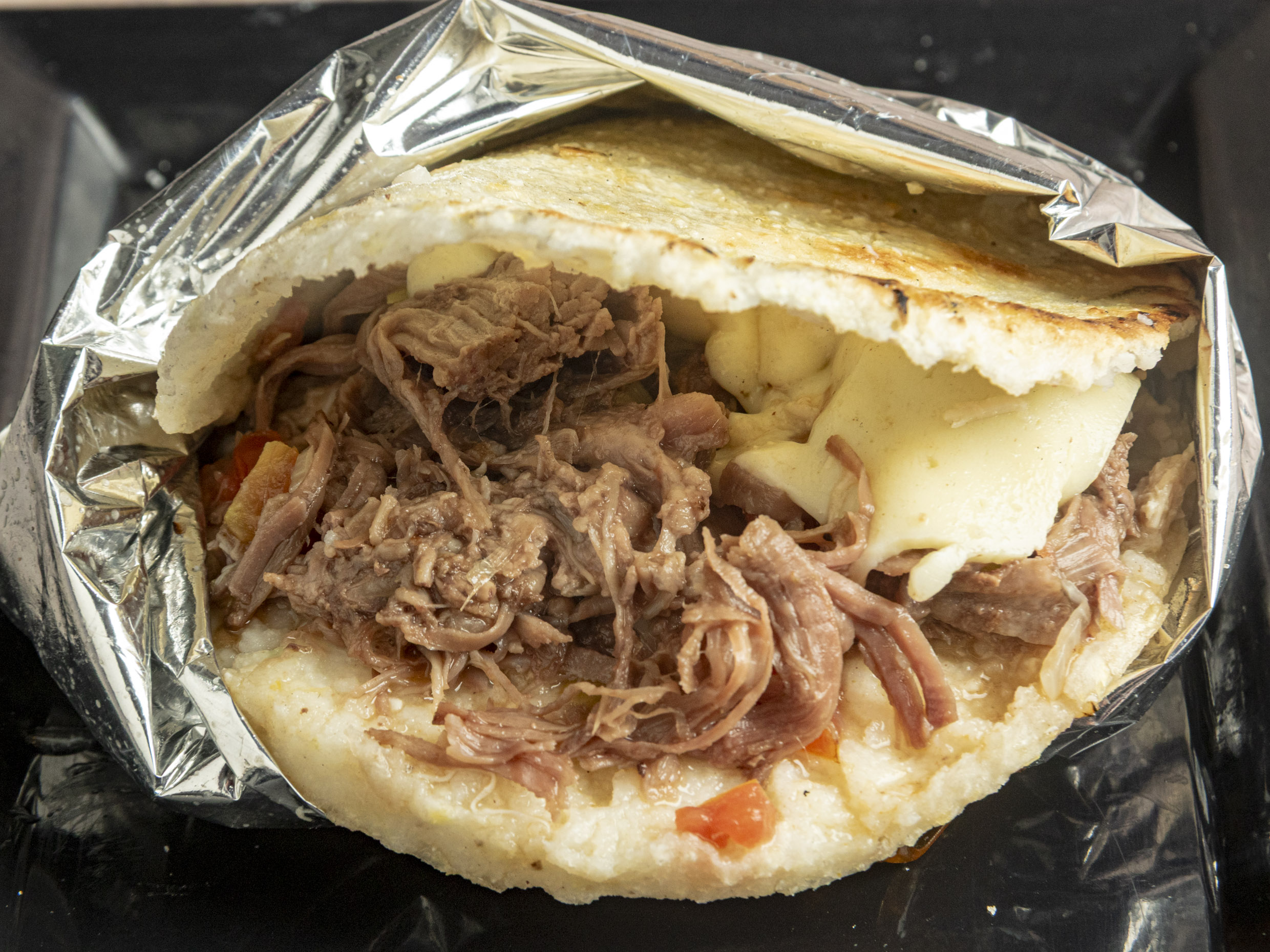 Arepa a base de maíz blanco, rellena de carne y pollo