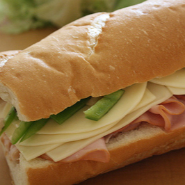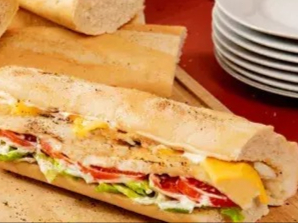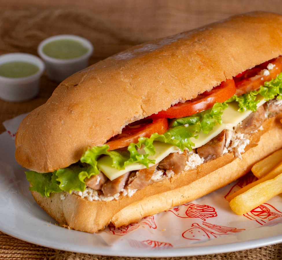 Pan Baguette, pechuga, carne, jamón, lechuga, tomate, cebolla, salsa de tomate y mayonesa.