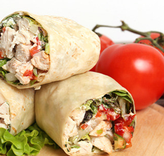 Tortilla, carne molida, queso crema, queso tajado, lechuga, tomate y cebolla. Wrap clásico