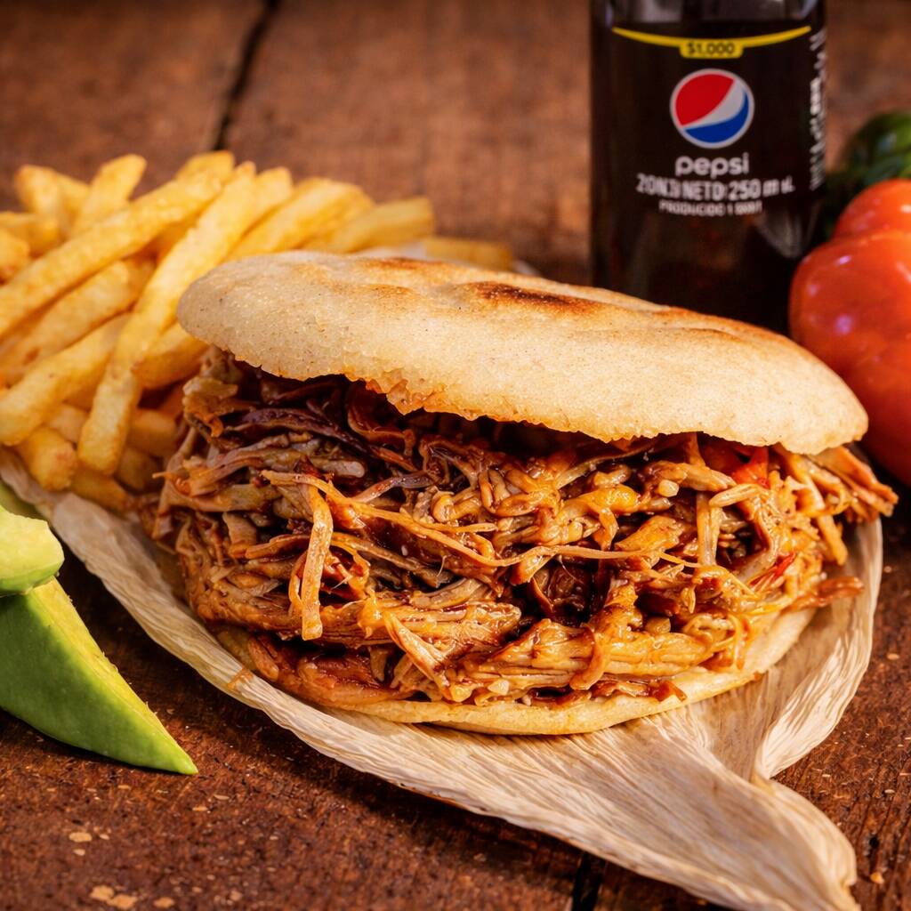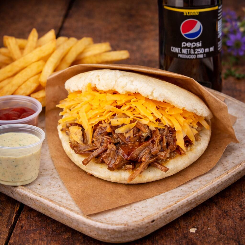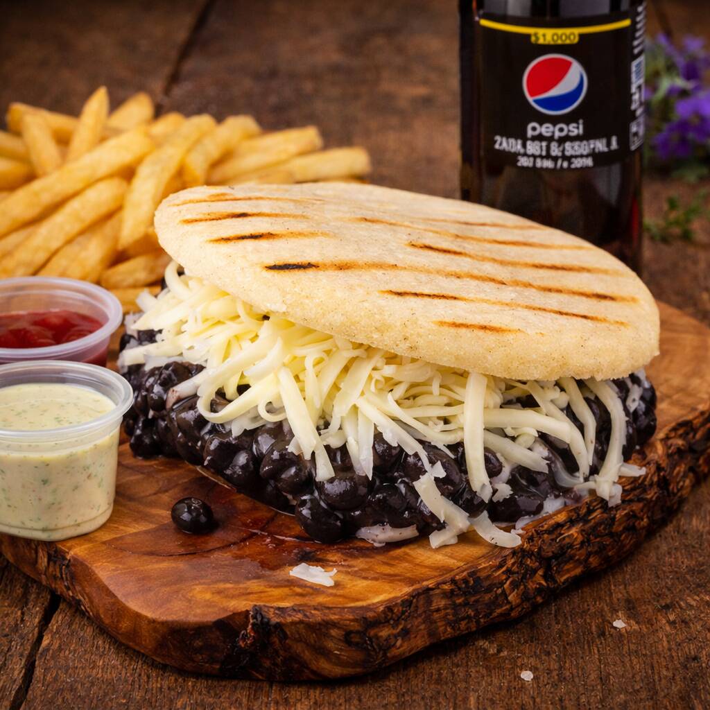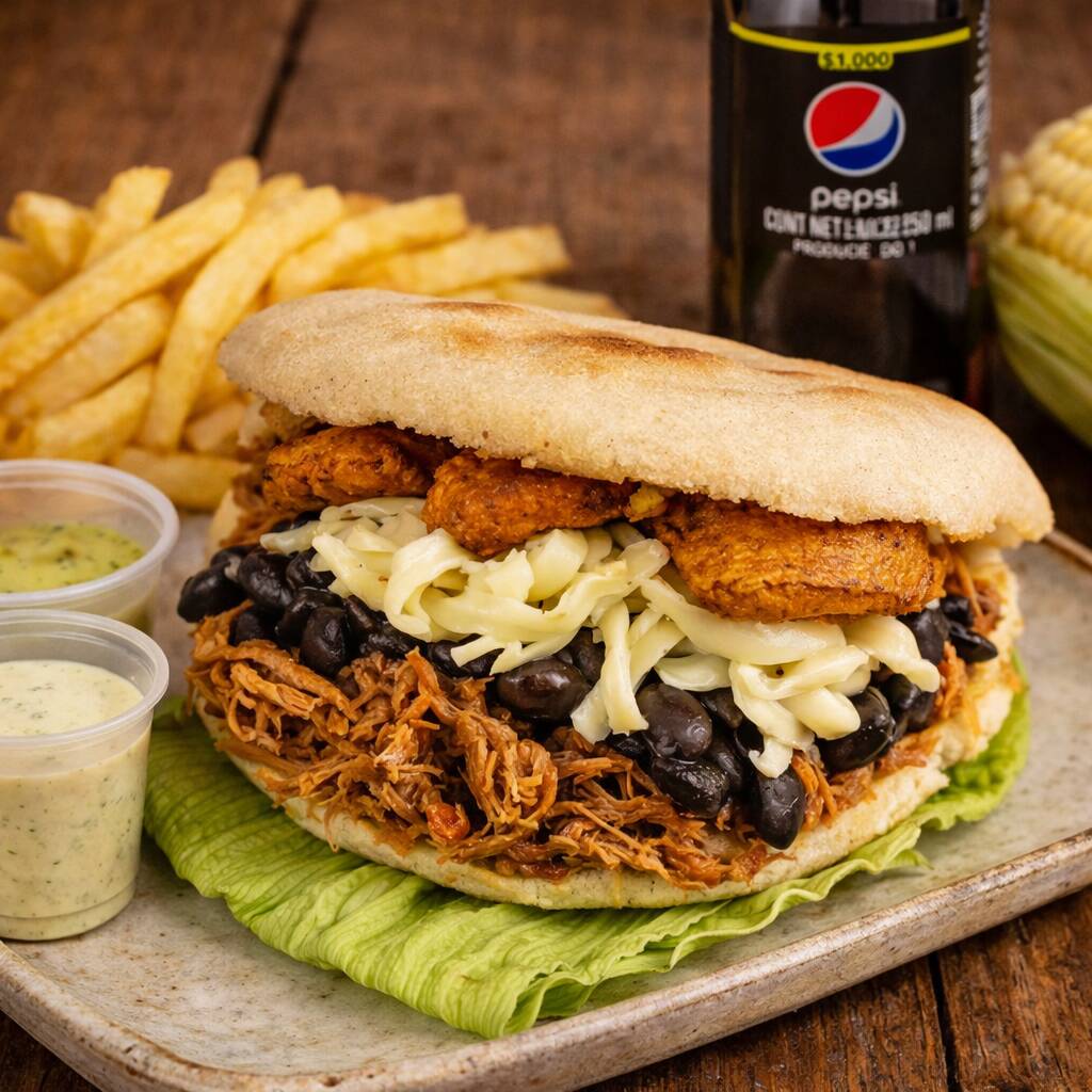 Arepa de maiz blanco, carne desmechada, frijol negro, maduro frito, queso costeño y salsa de ajo de la casa, papa la francesa artesanales y gaseosa 250ml