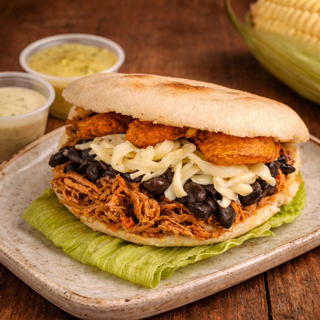 Arepa de maíz blanco precocida de 285 gramos en total, carne desmechada, frijol negro, maduro frito, queso costeño y salsa de ajo de la casa.