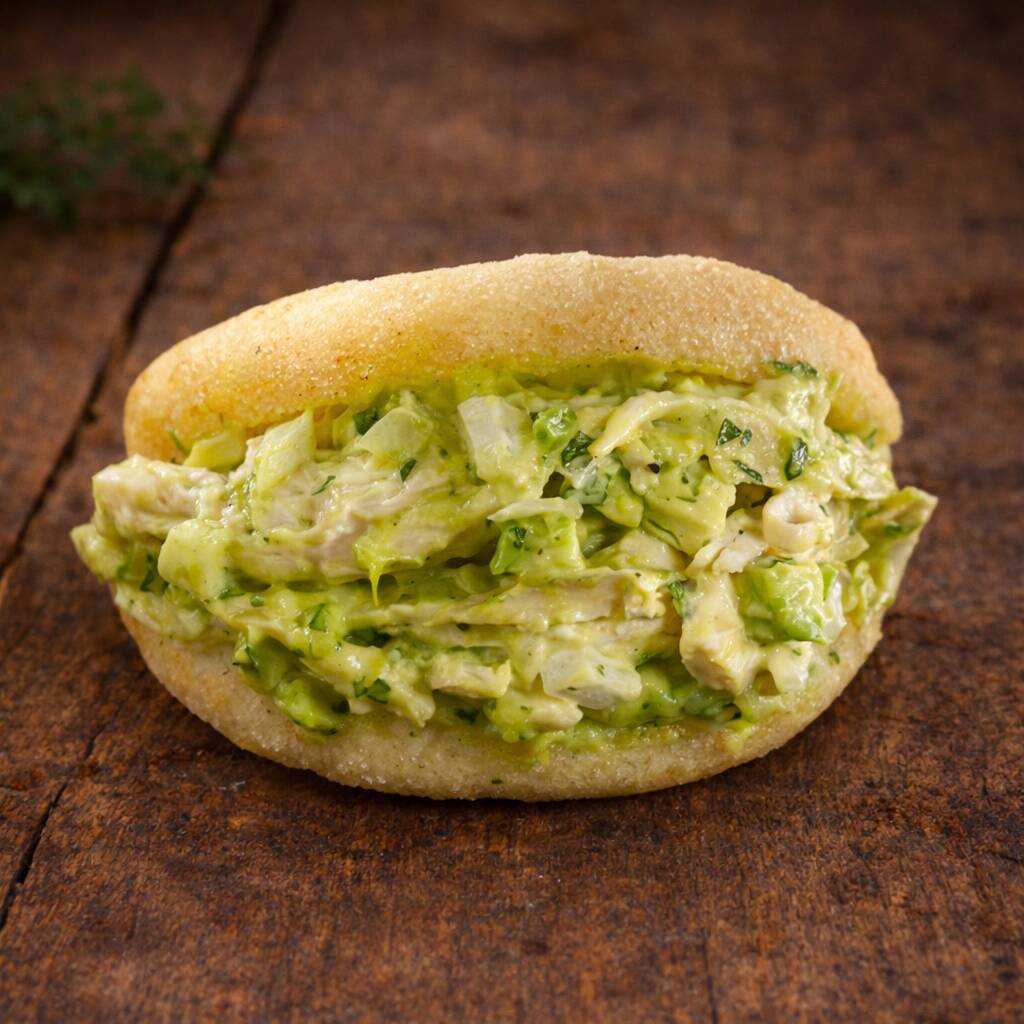 Arepa de maíz blanco, pollo desmechado, aguacate, queso costeño.