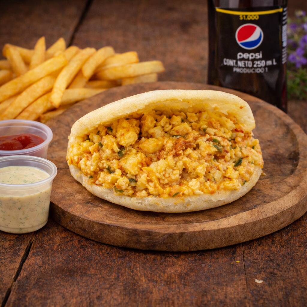 Arepa de maiz blanco, huevos pericos, chorizo y queso costeño, papa la francesa artesanales y gaseosa 250ml