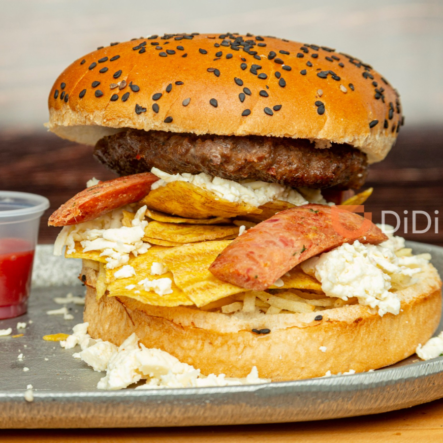 Carne a elegir (res, cerdo o pollo) pan brioche, suero, chips de plátano, queso costeño, chorizo y salsa de la casa.