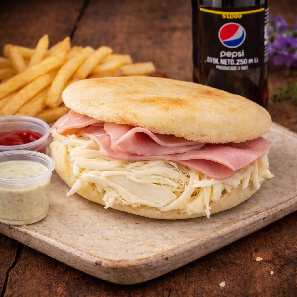 Arepa de maiz blanco, carne desmechada, frijol negro, jamon, queso, y salsa de ajo de la casa, papa la francesa y gaseosa 250ml