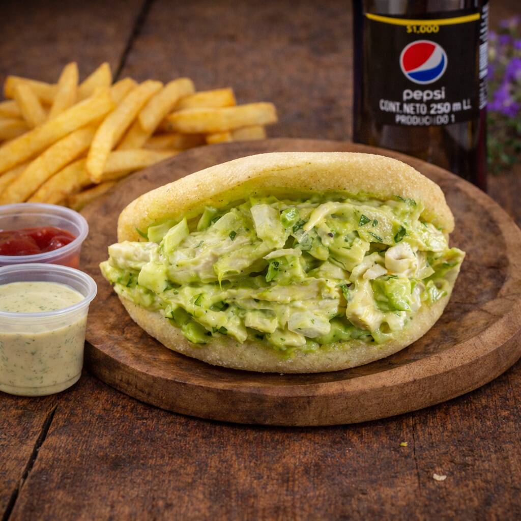 Arepa de maiz blanco, pollo desmechado, aguacate, queso costeño, papa la francesa artesanales y gaseosa 250ml