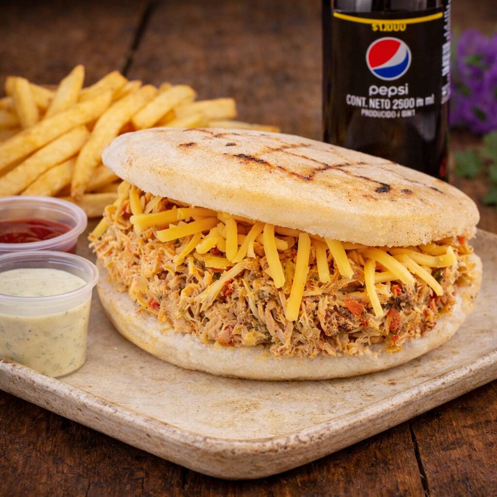 Arepa de maiz blanco, carne desmechada, pollo desmechado, queso, y salsa de ajo de la casa, papa la francesa artesanales y gaseosa 250ml