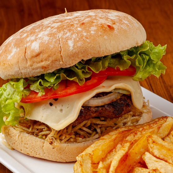 carne jugosa de 200 g, queso derretido, tocineta crocante, jamón, papa chips crujientes, vegetales frescos y salsas irresistibles en pan canilla.