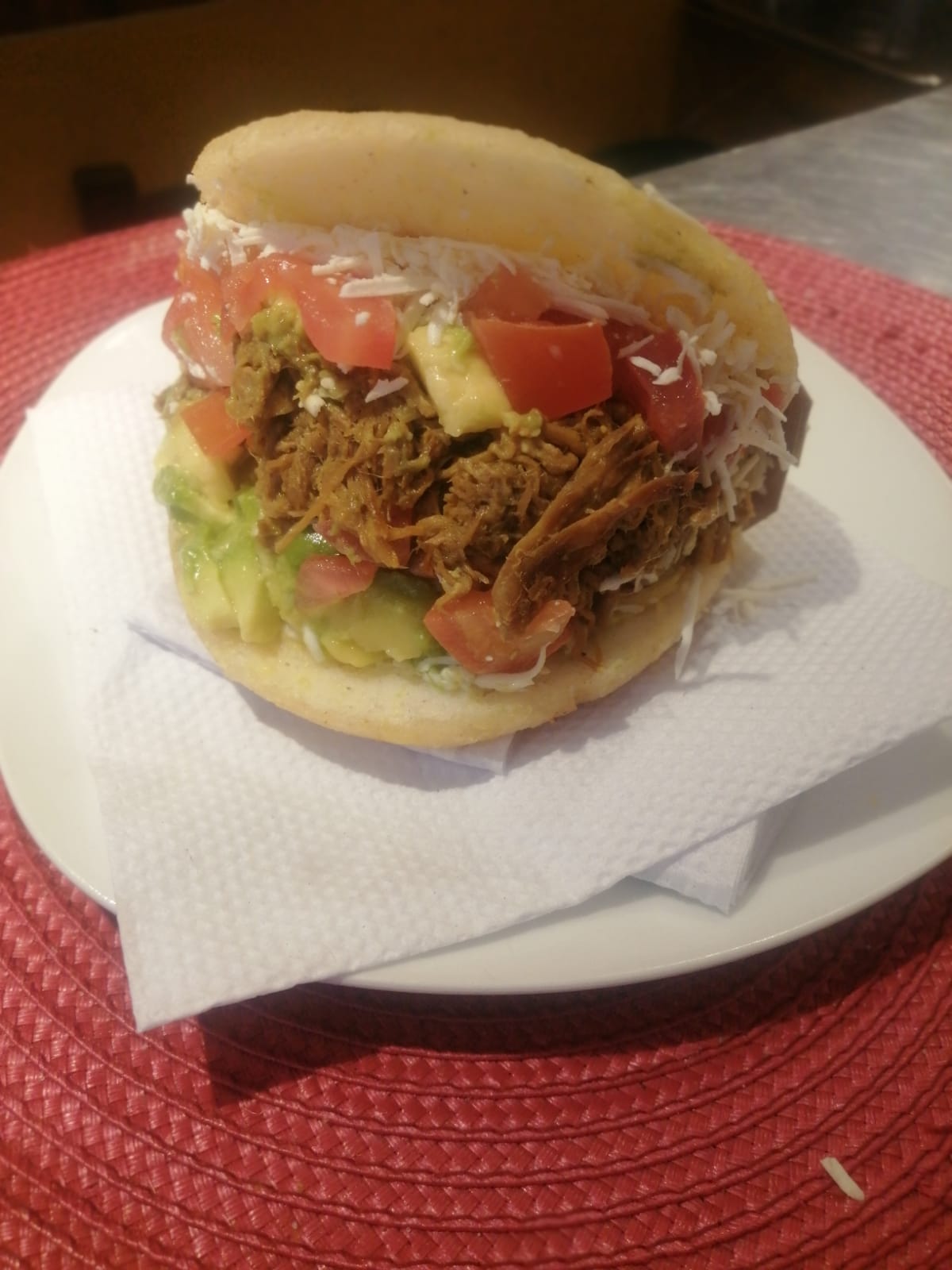 Carne Desmechada, Tomates fresco picado, aguacate y queso.